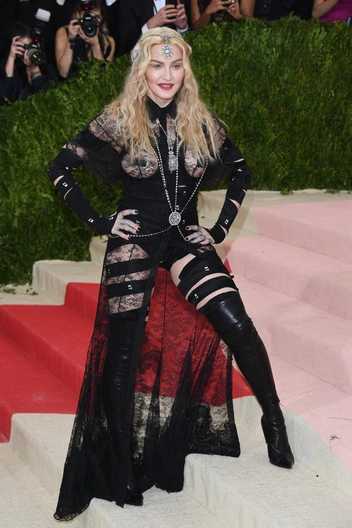 Спустя 30 лет Мадонна решила доказать, что находится в той же прекрасной форме, а желание провоцировать и шокировать публику ничуть не убавилось. В 2016 году звезда посетила традиционный бал Met Gala в кружевном боди от Givenchy и прозрачной накидке, дополненных цепочками и кожаными ботфортами.