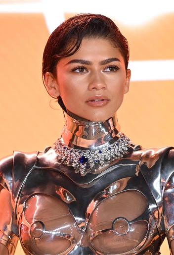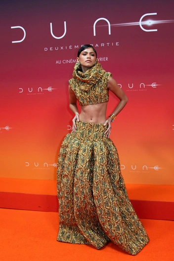 Пресс-тур второй части «Дюны» начался с Лас-Вегаса и мешковатого костюма Зендеи в песочном цвете. Это один из немногих случаев, когда Зендея распустила волосы — в остальных образах они зачесаны назад.