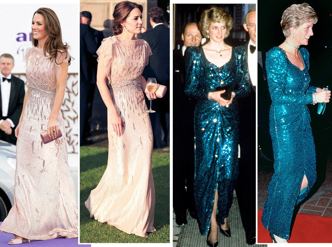 Второе стильное повторение принцесса также провернула с брендом Catherine Walker: дизайнер создала роскошное лазурное платье, усыпанное пайетками, в 1983 году. В образе принцесса появлялась довольно часто, экспериментируя с украшениями: во время визита в Австрию в 1986 году, а позже — на благотворительных балах в 1989 и 1990 годах.