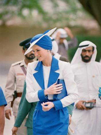 Если говорить о пристрастиях принцессы, то она любила шапки-бескозырки и маленькие шляпки с узкими или, напротив, очень широкими полями. Эксперименты же никогда не шли ей на пользу, и доказательство тому — визит в Дубай в 1989 году. Монаршая особа появилась на встрече в безупречном костюме бренда Catherine Walker, что до сих пор шьет одежду для королевы и герцогинь Британии. Завершением бело-синего образа стал эффектный тюрбан Philip Somerville, который не был оценен поклонниками Дианы (читайте также: Кейт, Камилла или Грейс Келли: чье помолвочное кольцо самое дорогое).