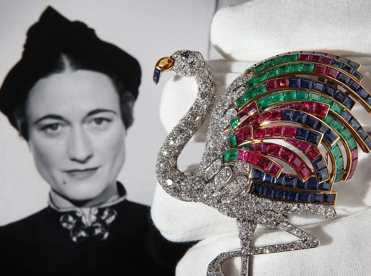 Одним из самых узнаваемых украшений Уоллис стала бриллиантовая брошь в виде фламинго с перьями, выполненными из рубинов, сапфиров и изумрудов. Эдвард приобрел ее для своей возлюбленной в 1940 году. Похожий красочный браслет с девятью крестами, состоящими из изумрудов, рубинов и сапфиров, был подарен Уоллис в день их свадьбы в 1937 году.