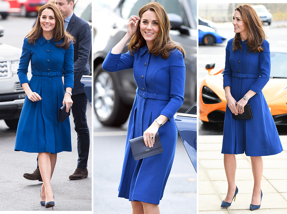 Своей модной традиции Кейт не изменила и 14 ноября в Южном Йоркшире. Тогда герцоги Кембриджские приехали в Ротерхэм, где их ждали сразу два мероприятия: открытие Технологического центра McLaren Automotive и посещение общежития для бездомных молодых людей Centrepoint. Для визита в Йоркшир герцогиня выбрала платье-пальто от британского бренда Eponine London в оттенке Royal Blue. Наряд нам уже давно знаком: в таком же платье супруга принца посещала центр Анны Фрейд в 2017 году. На этот раз герцогиня дополнила образ клатчем Smythson Panama, часами Cartier Ballon Bleu и лодочками в тон от Rupert Sanderson.