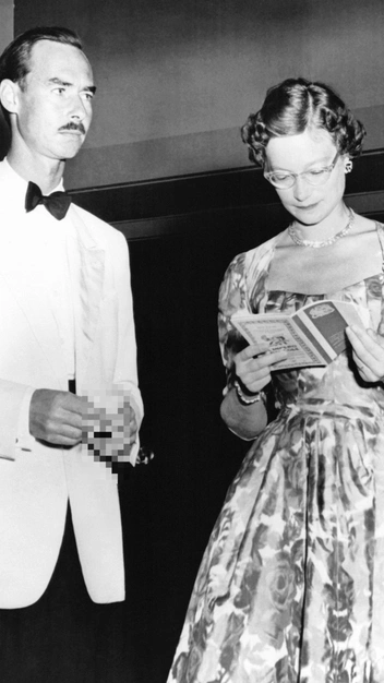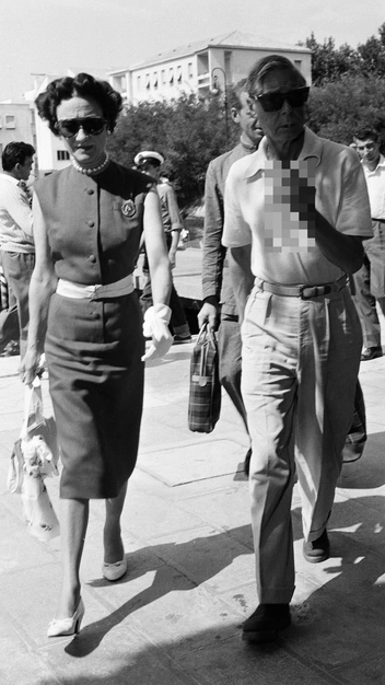 На этом снимке герцог и герцогиня Виндзорские, также известныекак бывший король Британии Эжуард и Уоллис Симпсон, на пристани Excelsior во время Венецианского кинофестиваля. На Уоллис дневное платье прямого покроя, жемчужное колье и крупные солнечные очки.