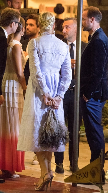 Наследный принц Норвегии Хокон и его жена Метте-Марит держались за руки, когда выходили из гондолы, прибывая в Лидо во время 73-го Венецианского кинофестиваля. На принцессе, чьи светлые волосы заплетены в «корзинку», было нежно-голубое платье с деликатными рюшами на воротнике и манжетах и серебристые босоножки, а в руках она держала вечерню сумку, украшенную перьями марабу. В ушах Метте-Марит сверкали крупные необработанные жемчужины.