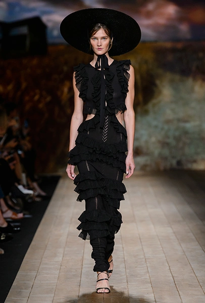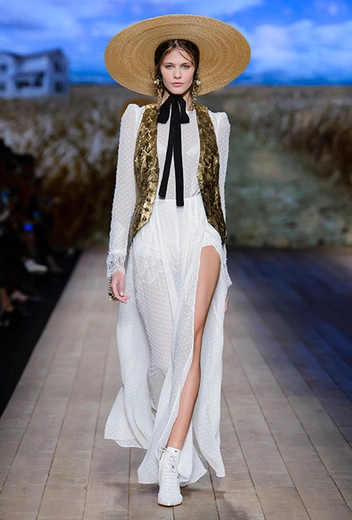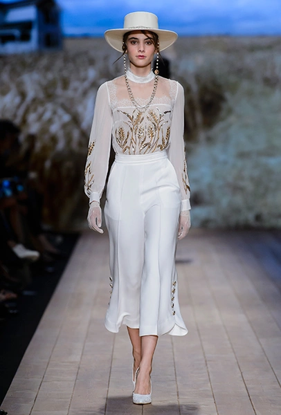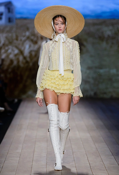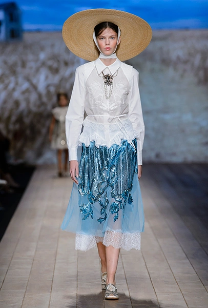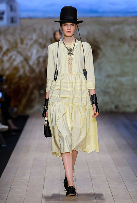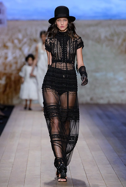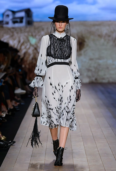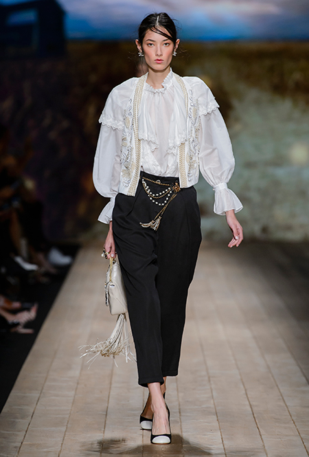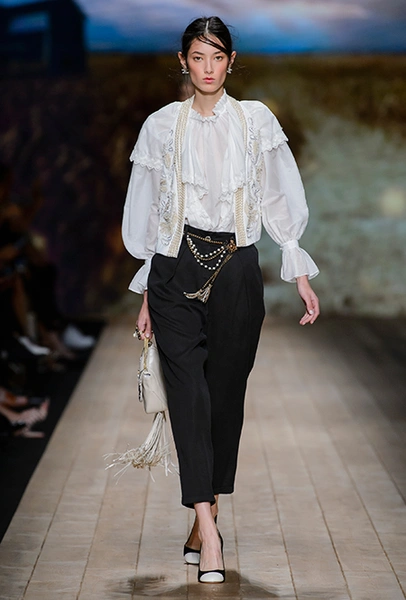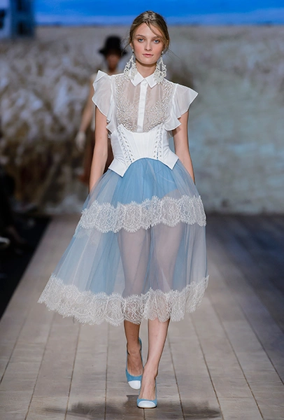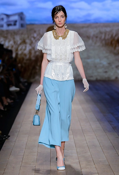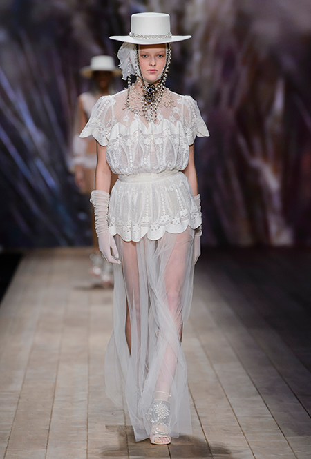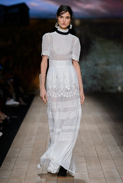 В коллекции очень много оборок и кружева, белого, бежевого и светло-розового. Объёмные рукава, невесомые, летящие ткани. Вся эта «викториана» заставляет вспомнить о культовом «Пикнике у висячей скалы» или о недавнем «Роковом искушении» Софии Копполы. Поверх таких платьев дизайнер надевает на моделей приталенные жакеты с удлиненными сзади басками, а их руки прячет в изящные, украшенные вышивкой полупрозрачные перчатки.