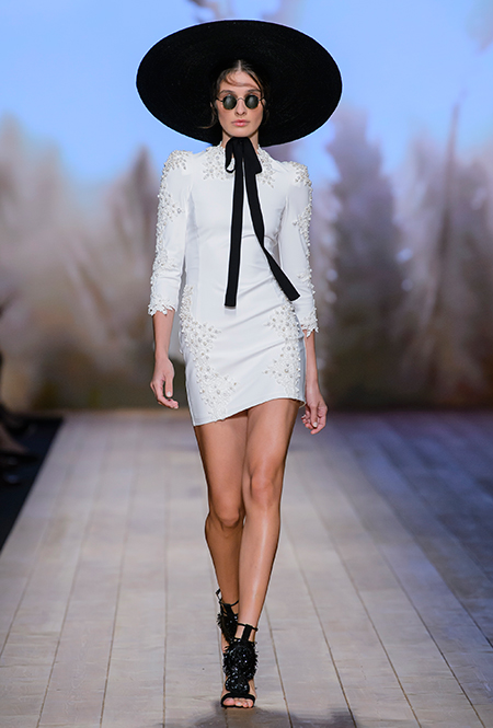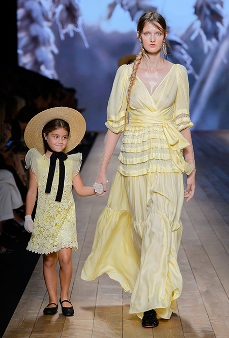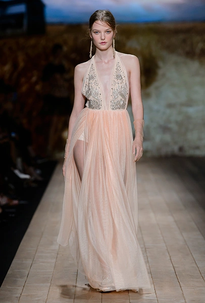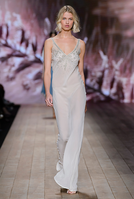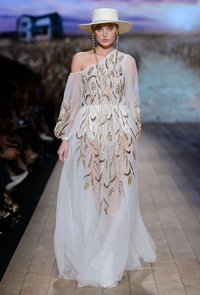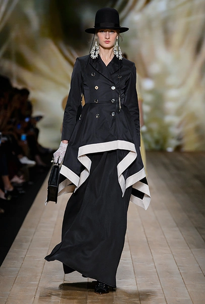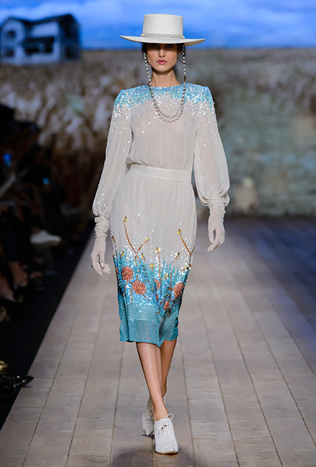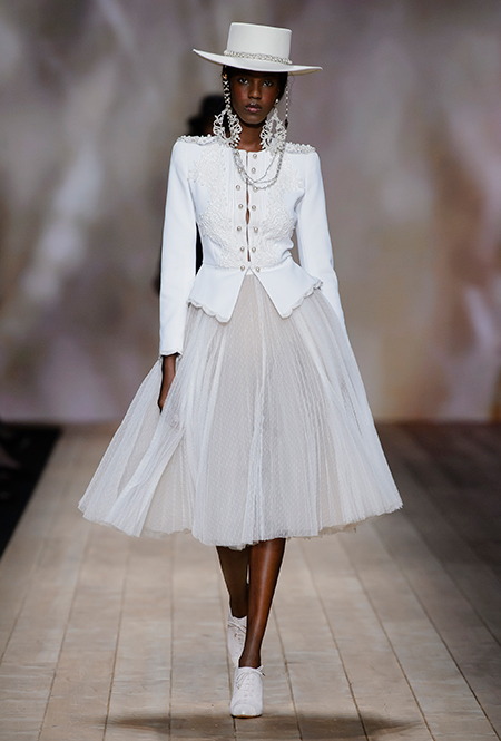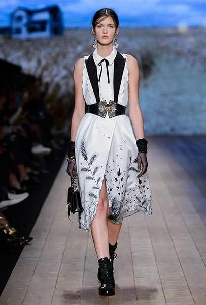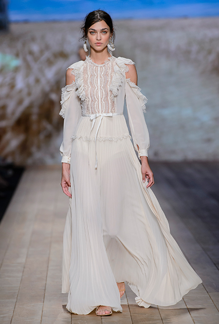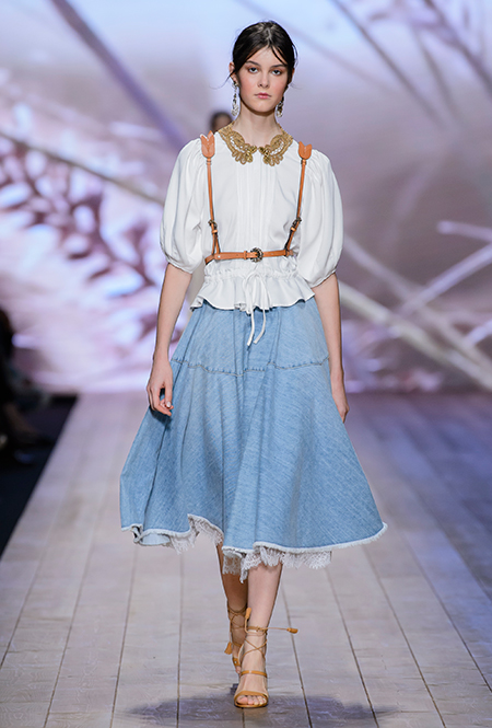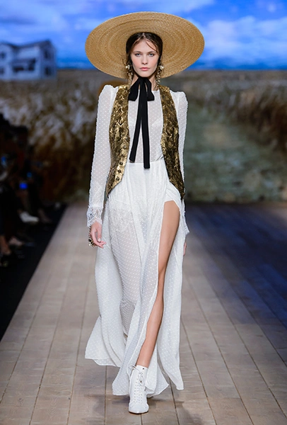 В коллекции очень много оборок и кружева, белого, бежевого и светло-розового. Объёмные рукава, невесомые, летящие ткани. Вся эта «викториана» заставляет вспомнить о культовом «Пикнике у висячей скалы» или о недавнем «Роковом искушении» Софии Копполы. Поверх таких платьев дизайнер надевает на моделей приталенные жакеты с удлиненными сзади басками, а их руки прячет в изящные, украшенные вышивкой полупрозрачные перчатки.