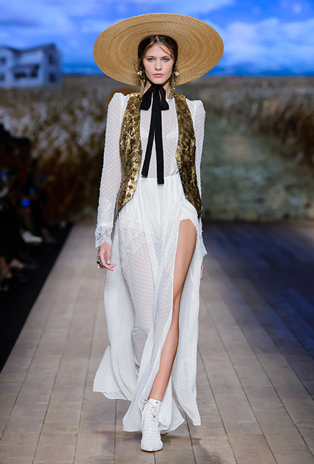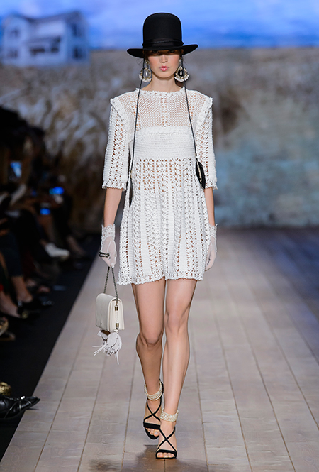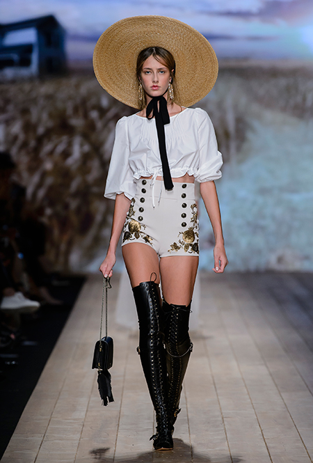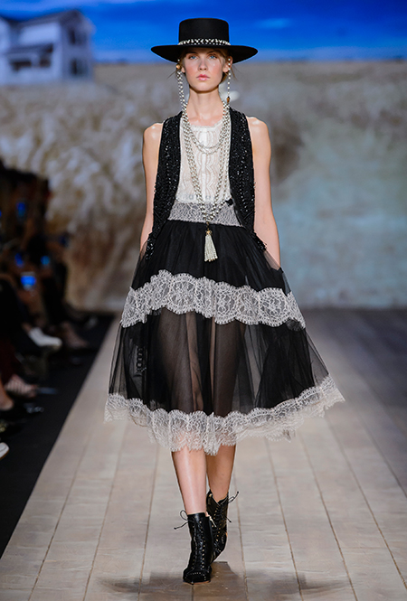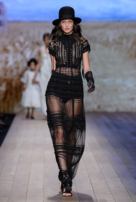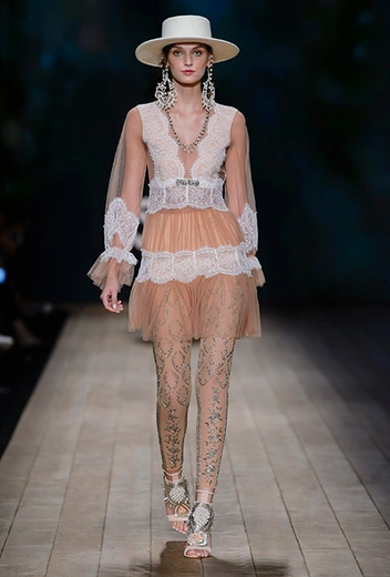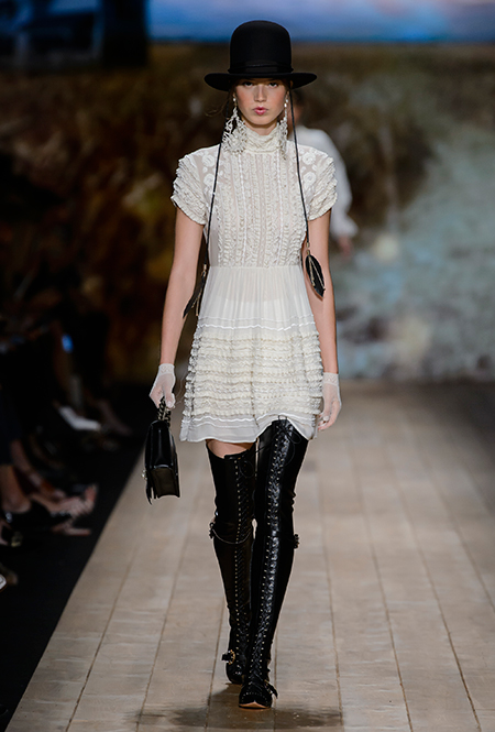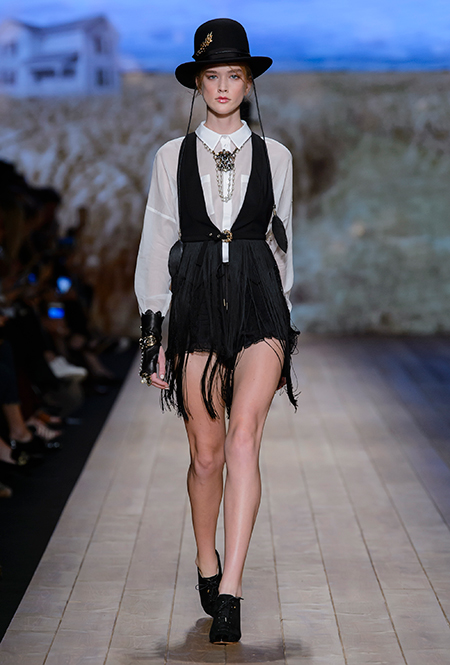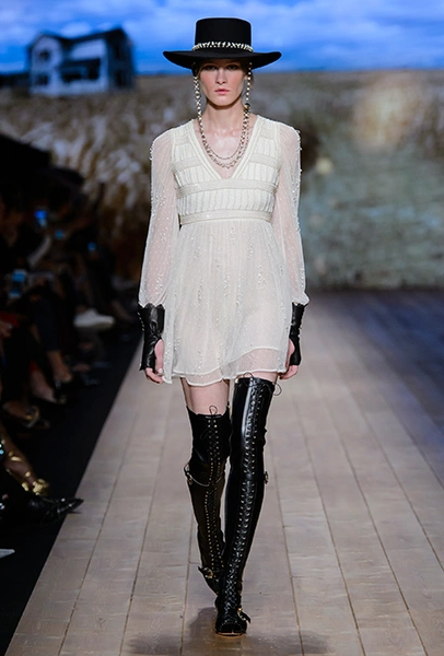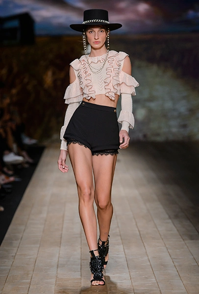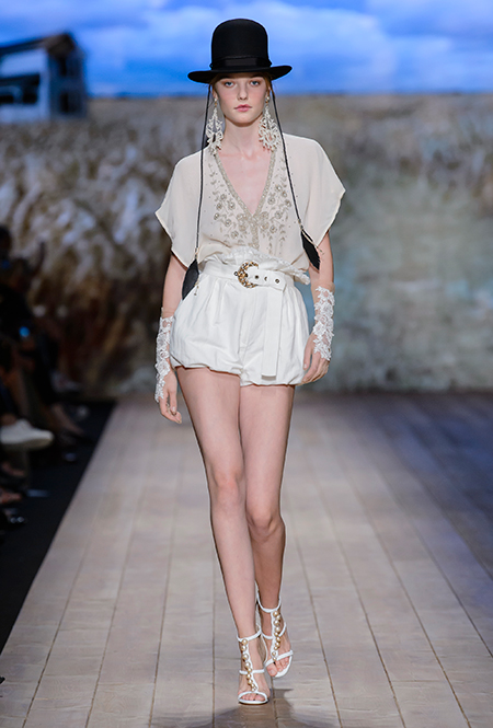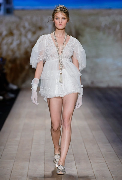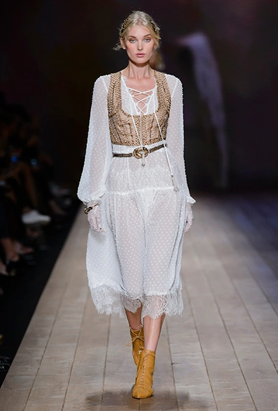 Но одной романтики Франки оказалось мало. Чтобы ее коктейль не получился чересчур приторным, она добавила «секса» и в хорошем смысле китча. Тут и там светлая ткань усыпана серебряными блестками, расшита бисером и крупными бусинами (белые бусы вообще один из главных аксессуаров коллекции). Главная обувь показа – ботфорты. Классические или на шнуровке, они дополняют короткие шорты и платья (длины мини тоже хватает). Здесь есть платья-корсеты, облегающие наряды из чёрного кружева, один – с эротичными вырезками по бокам. Сама Элизабетта не скрывает, что кроме вестернов, вдохновлялась и модой 80-х. И, пожалуй, надо обладать настоящим талантом, чтобы так удачно замиксовать в одной коллекции эти, казалось бы, бесконечно далекие друг от друга эпохи.
