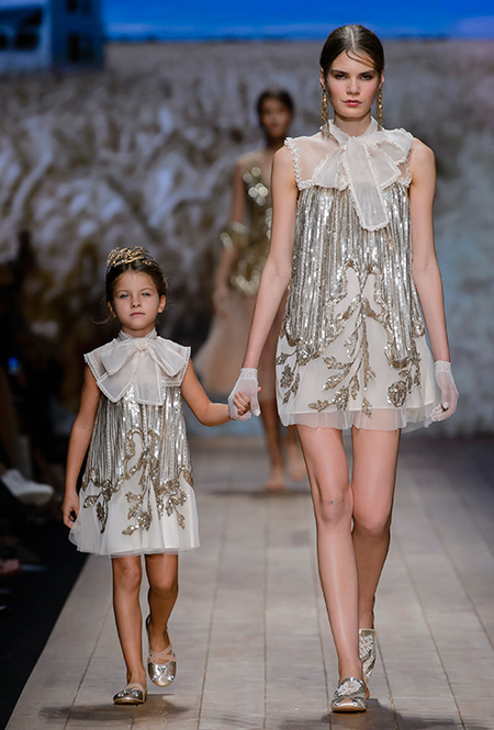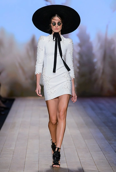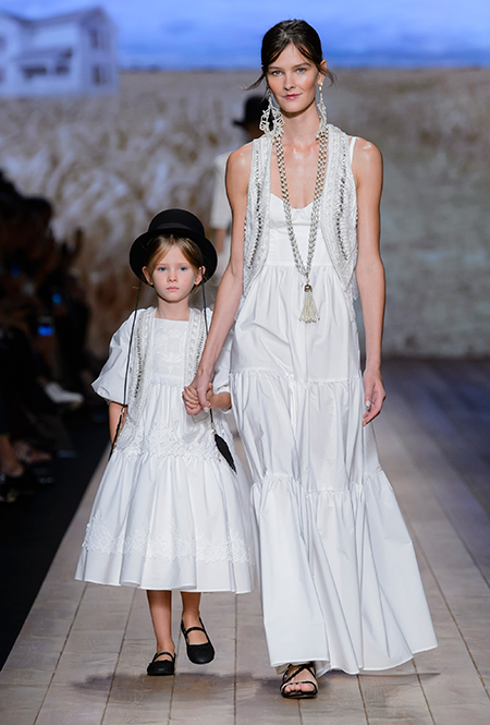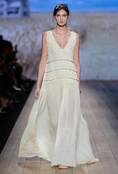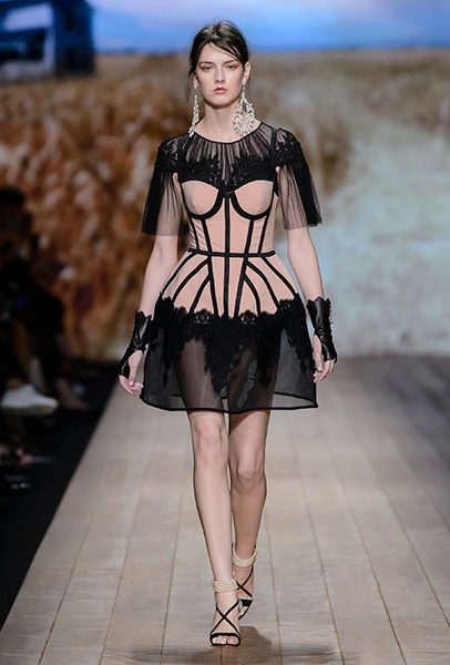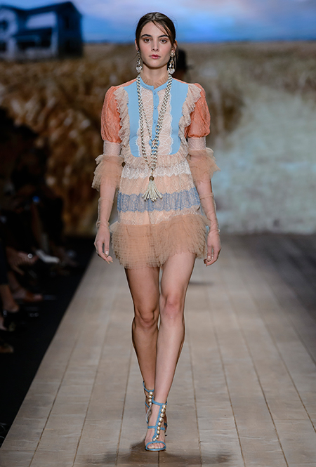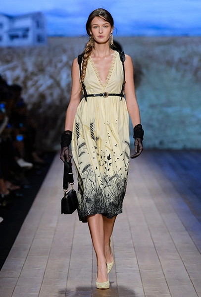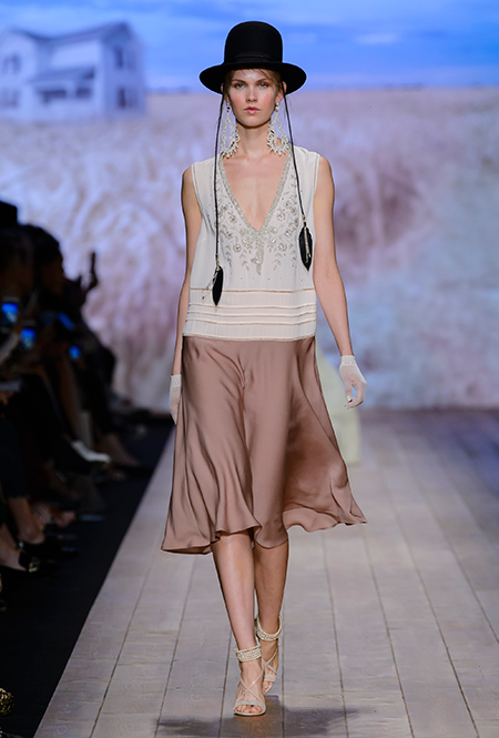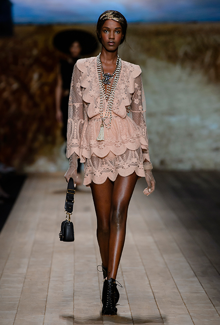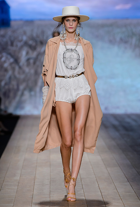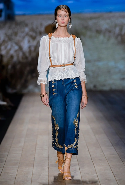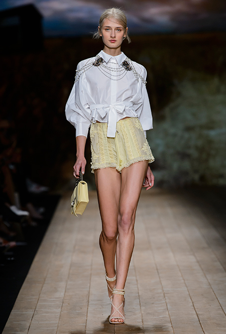 Но одной романтики Франки оказалось мало. Чтобы ее коктейль не получился чересчур приторным, она добавила «секса» и в хорошем смысле китча. Тут и там светлая ткань усыпана серебряными блестками, расшита бисером и крупными бусинами (белые бусы вообще один из главных аксессуаров коллекции). Главная обувь показа – ботфорты. Классические или на шнуровке, они дополняют короткие шорты и платья (длины мини тоже хватает). Здесь есть платья-корсеты, облегающие наряды из чёрного кружева, один – с эротичными вырезками по бокам. Сама Элизабетта не скрывает, что кроме вестернов, вдохновлялась и модой 80-х. И, пожалуй, надо обладать настоящим талантом, чтобы так удачно замиксовать в одной коллекции эти, казалось бы, бесконечно далекие друг от друга эпохи.