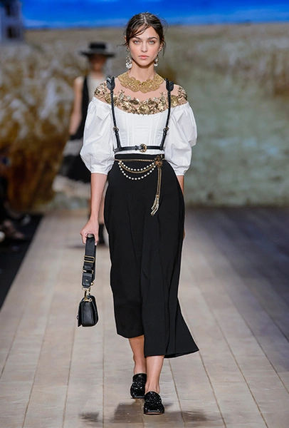 Любители копаться в прошлом отыщут ещё одну отсылку – здесь есть блестящие платья с прямым силуэтом в духе 20-х. Отсюда же родом и самая трогательная ретро-деталь: поверх блузок у некоторых моделей в качестве украшения надеты тонкие ремни, напоминающие мужские подтяжки.