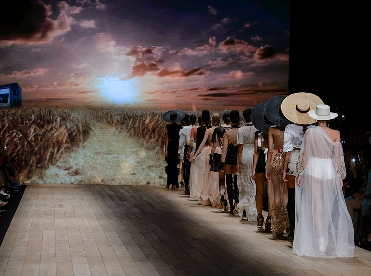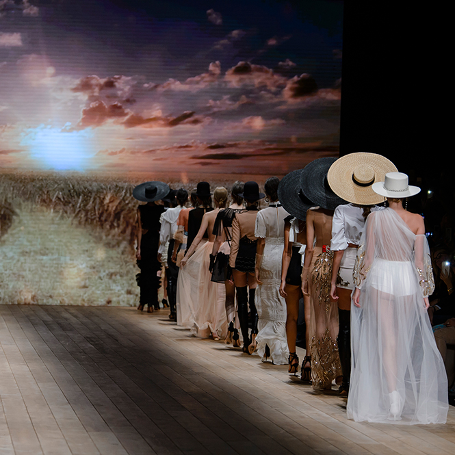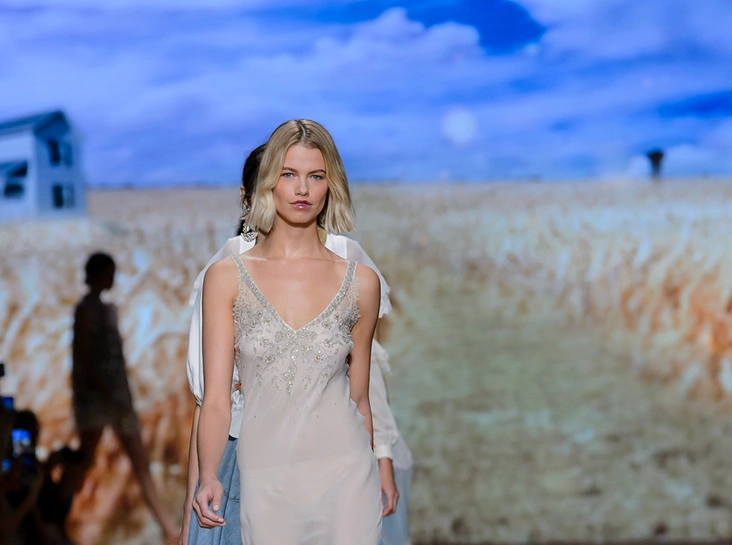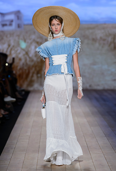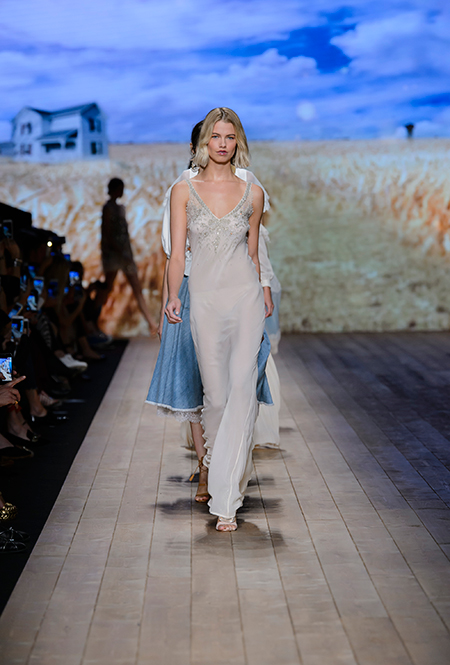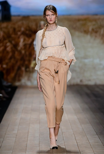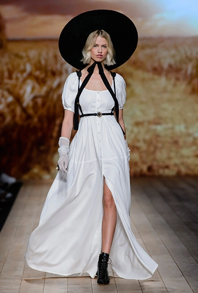 Мудборд коллекции, висевший на бекстейдже показа, почти полностью состоял из кадров вестернов и фотографий пейзажей Дикого Запада. Главной и единственной декорацией шоу стал большой экран со снимком поля с колышущейся рожью. Словом, все говорило о том, что девушка сезона SS 2018 для Элизабетты Франки – подружка ковбоя, а то и сама лихая наездница.