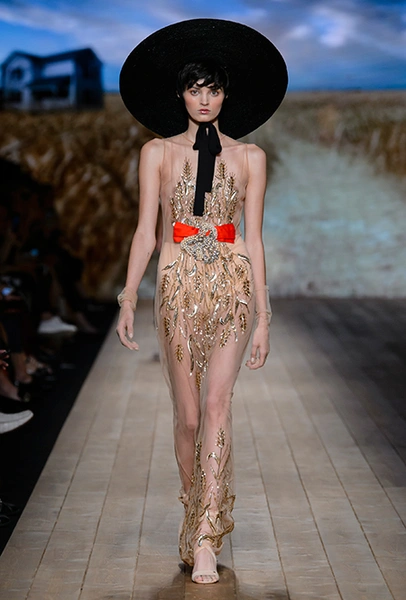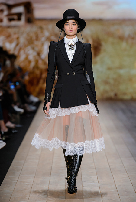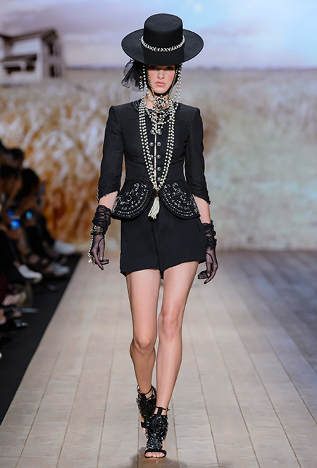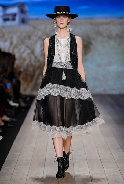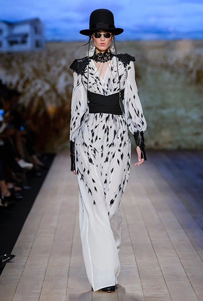 Это оказалось правдой, но лишь отчасти. За «ковбойскую» тему в коллекции отвечают шляпы с невероятно широкими полями, брюки-клёш, укорочённые жакеты и кое-где длинная бахрома. Но в целом возникает впечатление, что если Франки и интересна Америка второй половины ХIX столетия, то, скорее, ее гостиные и салоны, чем дикие прерии.