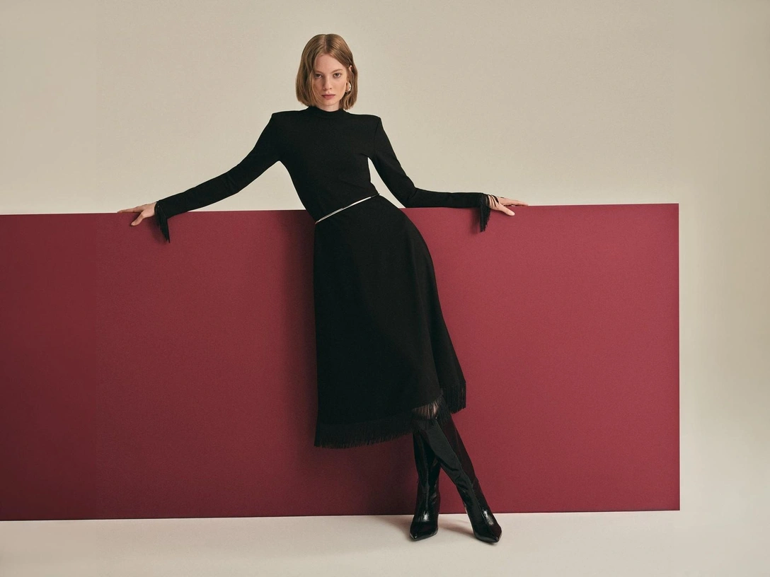 Совет стилиста: платье с бахромой легко комбинируется с вещами из разных капсул: с укороченным пиджаком и лодочками — в офис, чтобы хладнокровно бороться с конкурентами и завоевывать новые высоты; с минималистичными босоножками, массивными золотыми украшениями и «зализанным» пучком — для вечернего выхода, где вы точно произведете незабываемое впечатление.