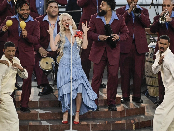 Наравне с оттенком сливочного масла в 2025-м завирусился и небесно-голубой. Но если тогда его предлагали сочетать преимущественно со столь же модным бургунди, то в этом году ставки повышаются, а образы обретают куда более насыщенную гамму. Именно это мы видим на примере певицы, которая выступила в перерыве матча в голубом платье LUAR и дополнила его не бордовыми, а ярко-красными акцентами.
