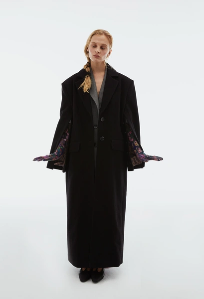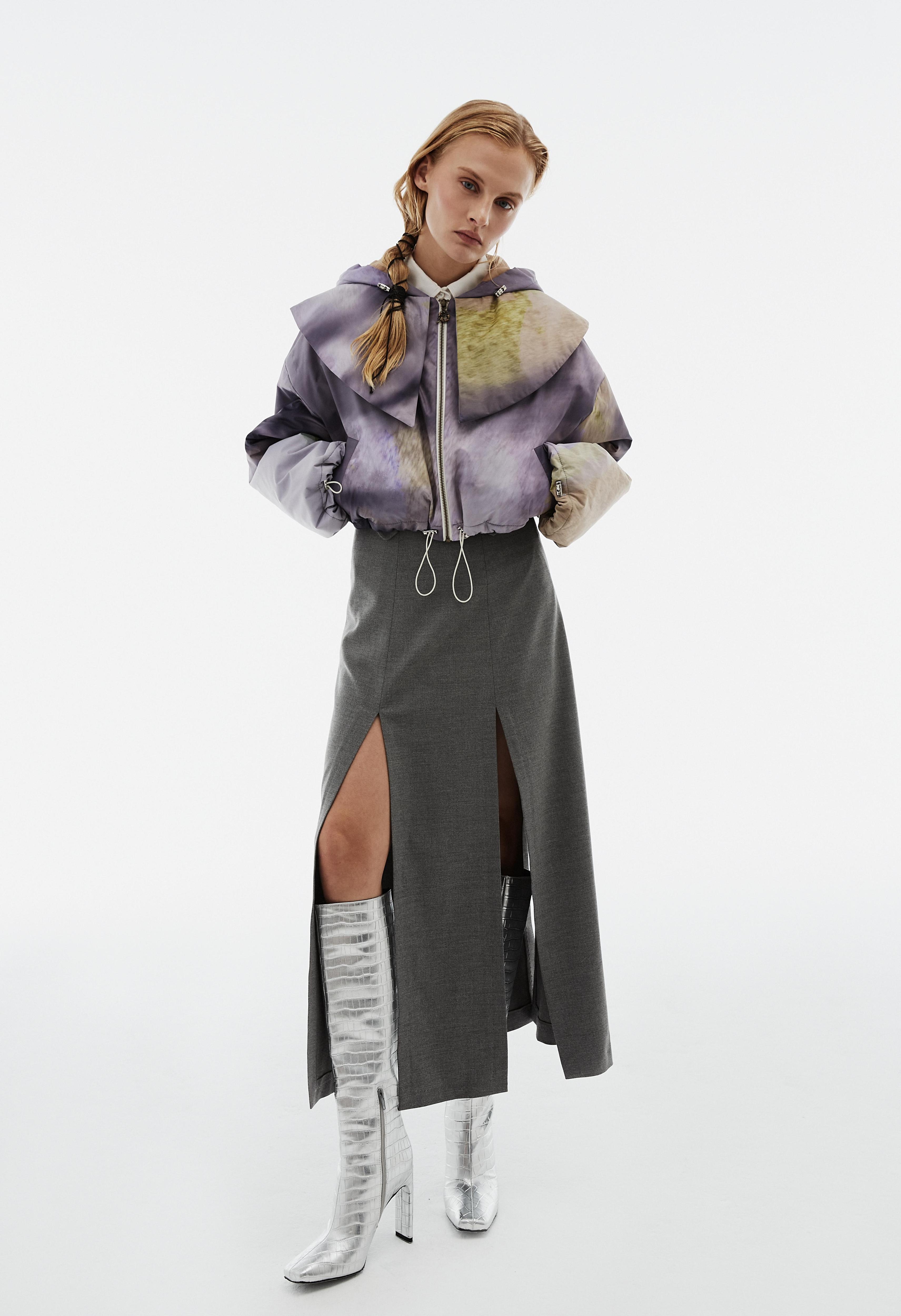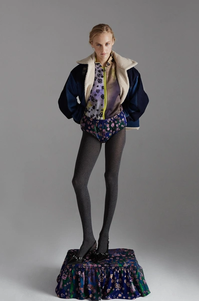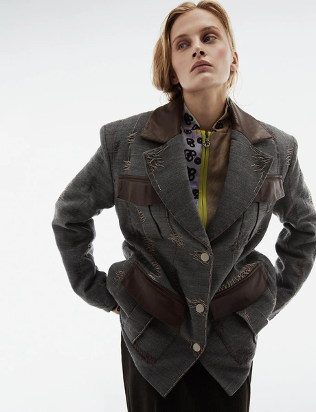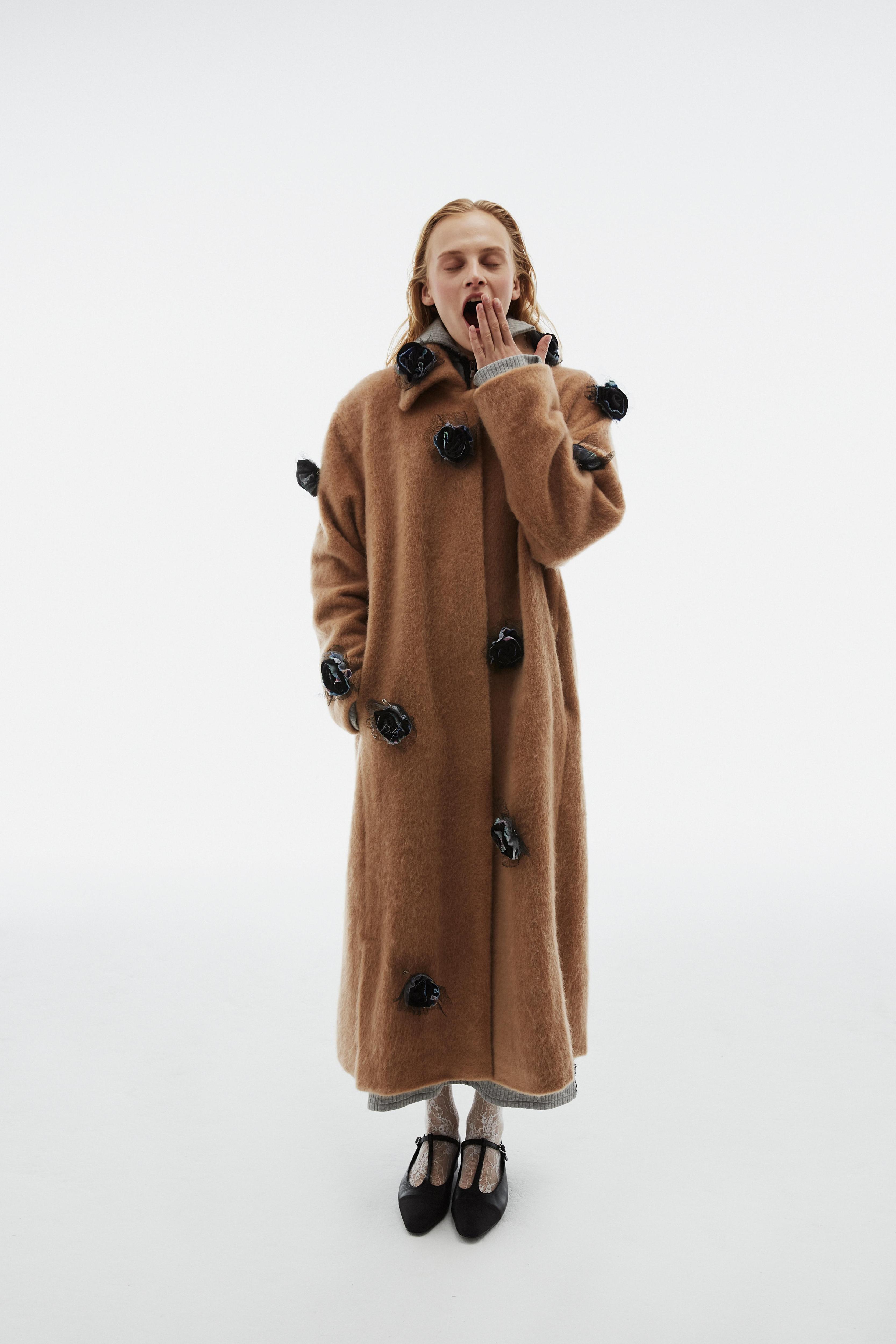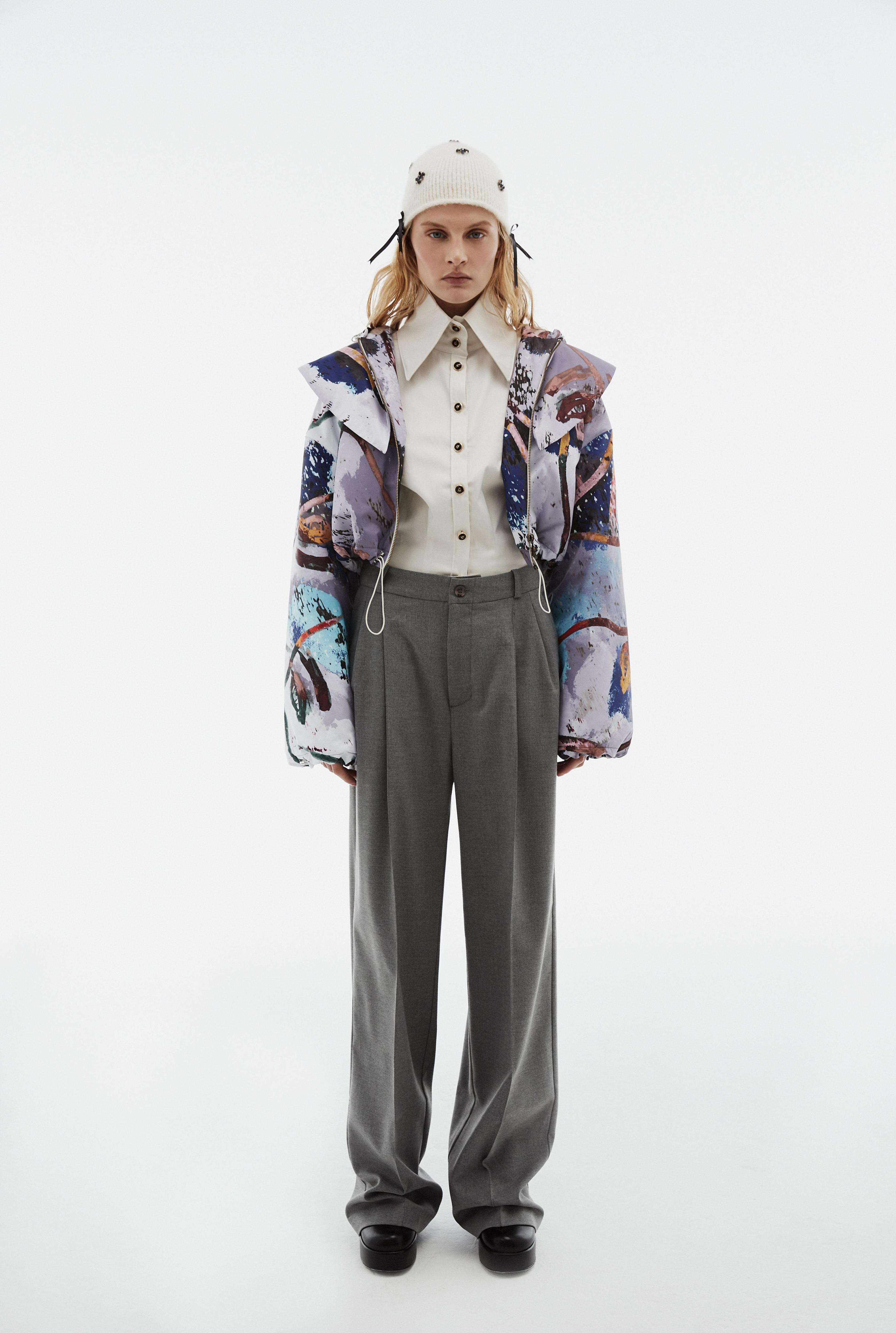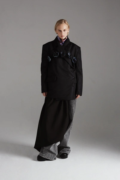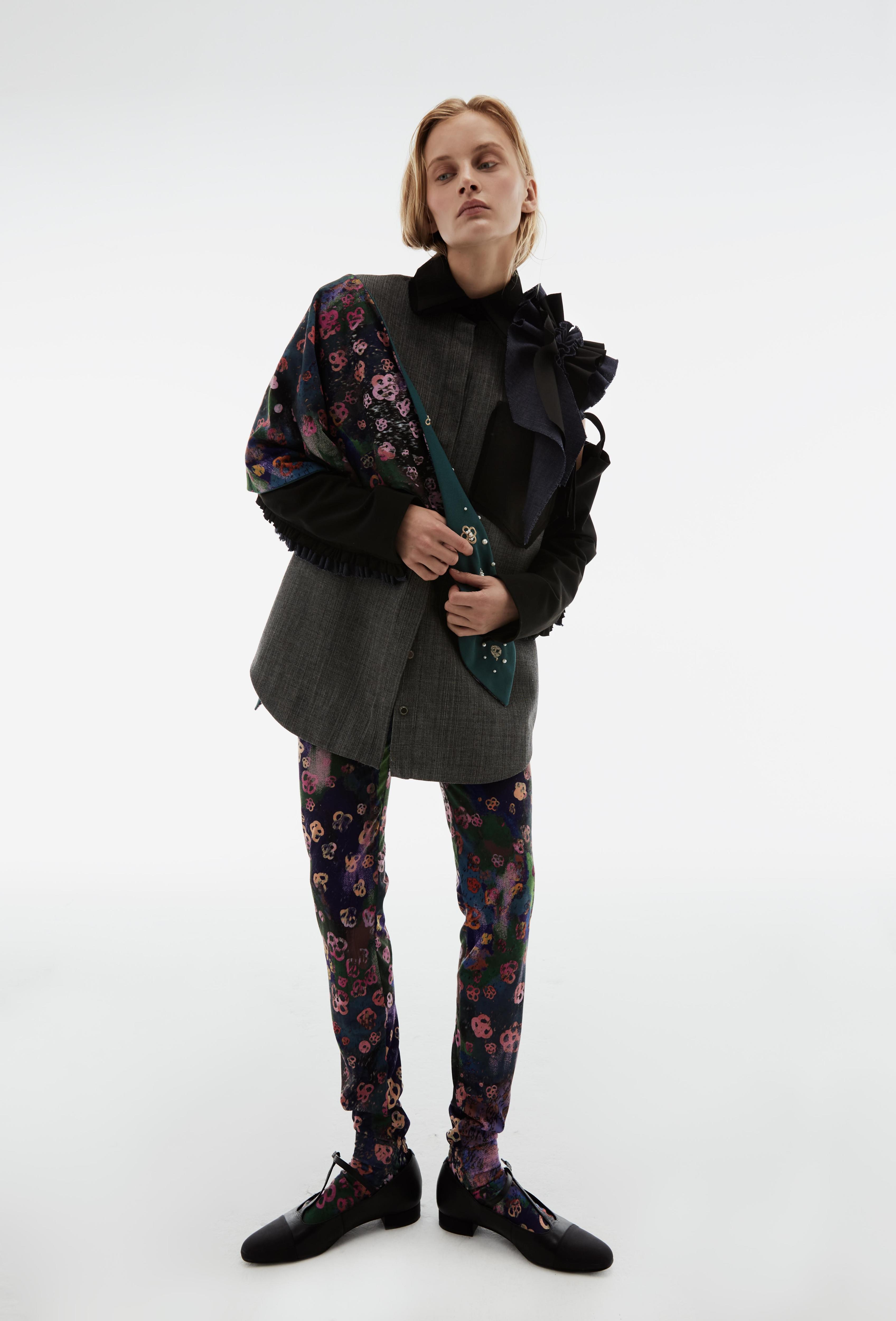 В центре коллекции облегченные пальто из нано-технологичного материала, усыпанные цветами, укороченные пиджаки с отделкой из кожи в дуэте с корсетом и ассиметричной юбкой. Эффектные колготки с авторским принтом и перчатки дополняют образ с блузкой, вдохновленной винтажным гардеробом бабушки дизайнера. В новой коллекции вы найдете не только необыкновенные предметы одежды, но и украшения из керамики — серьги и чокер в виде цветка неправильной формы, который стал символом коллекции.