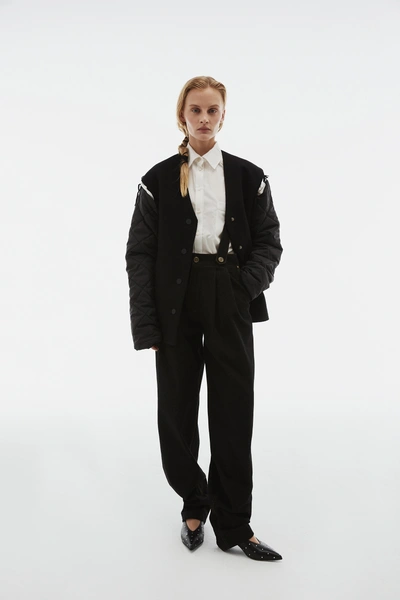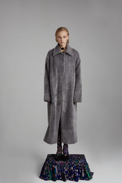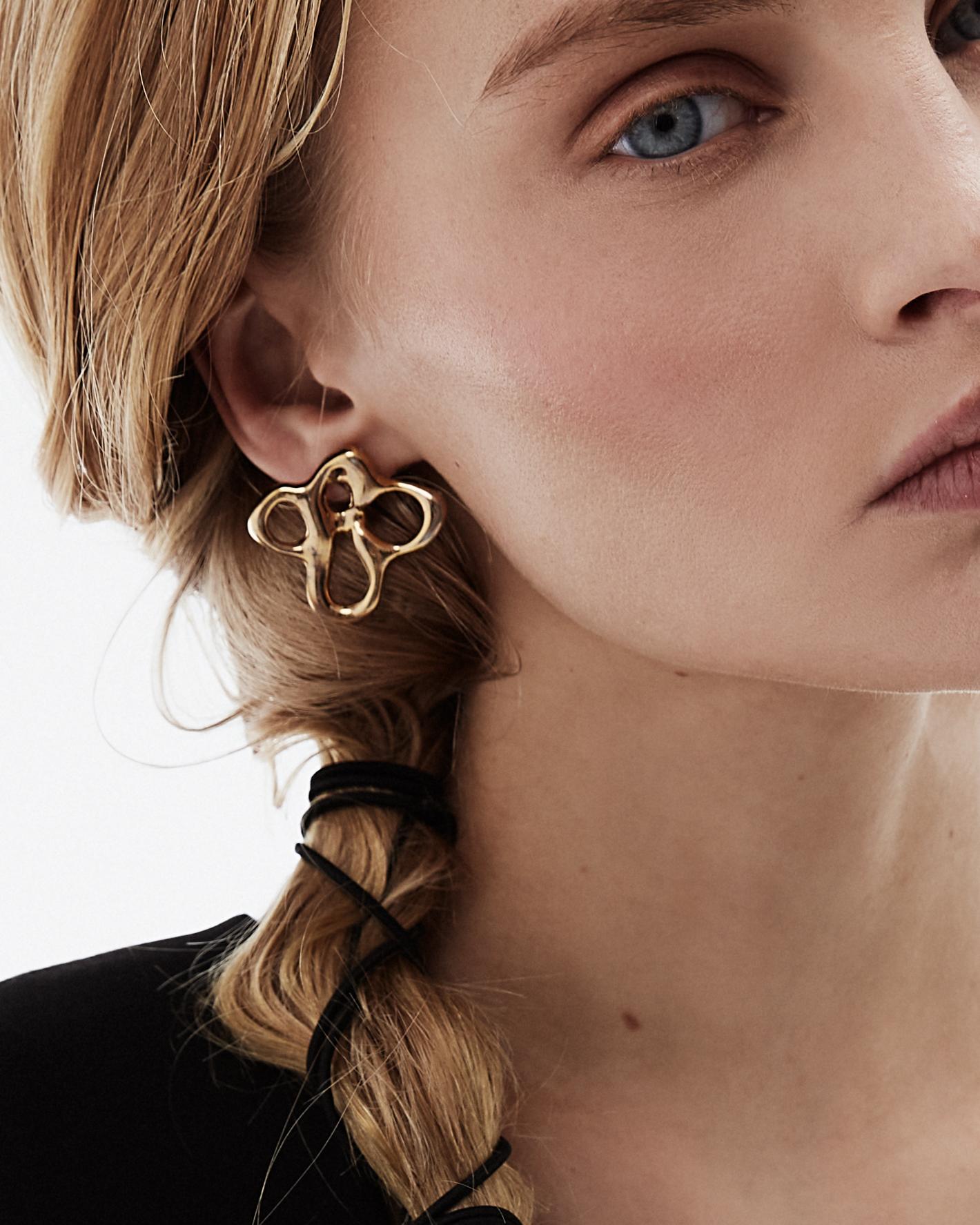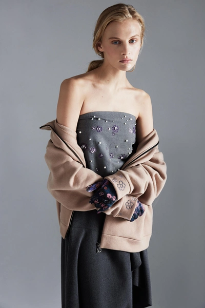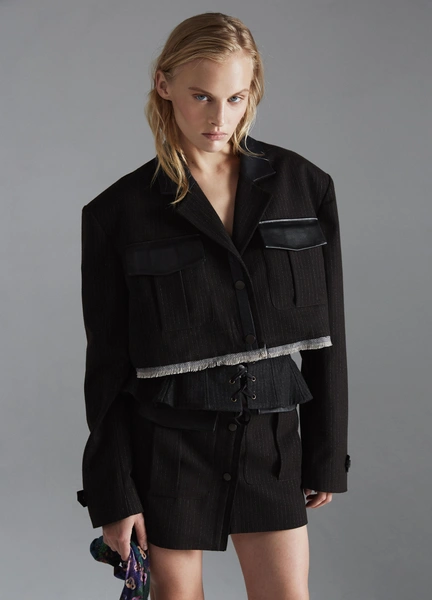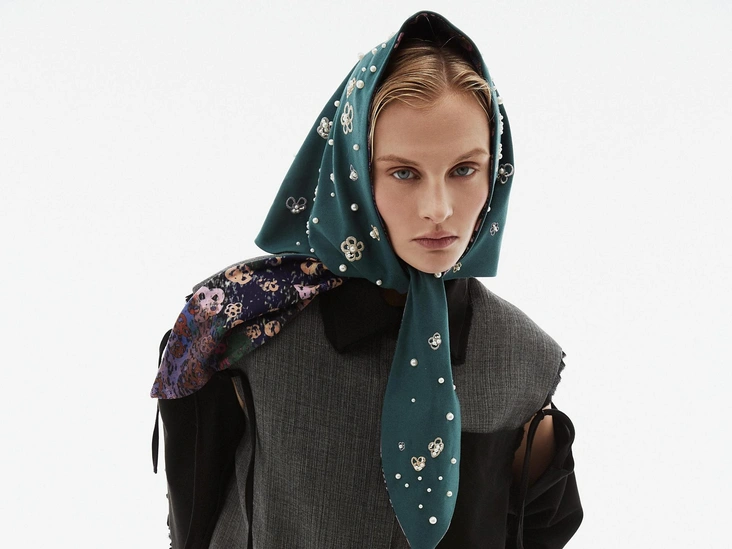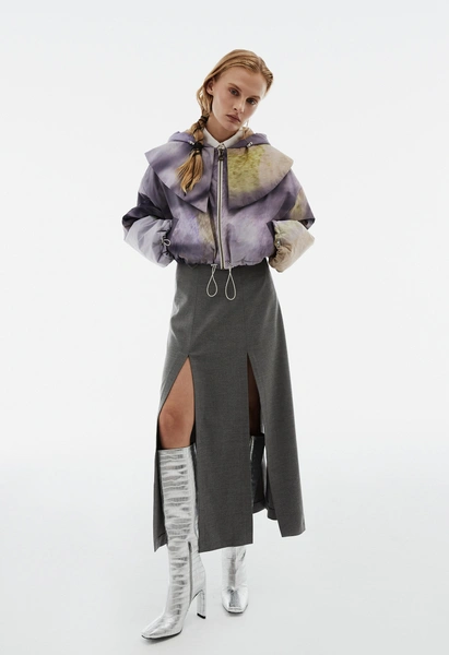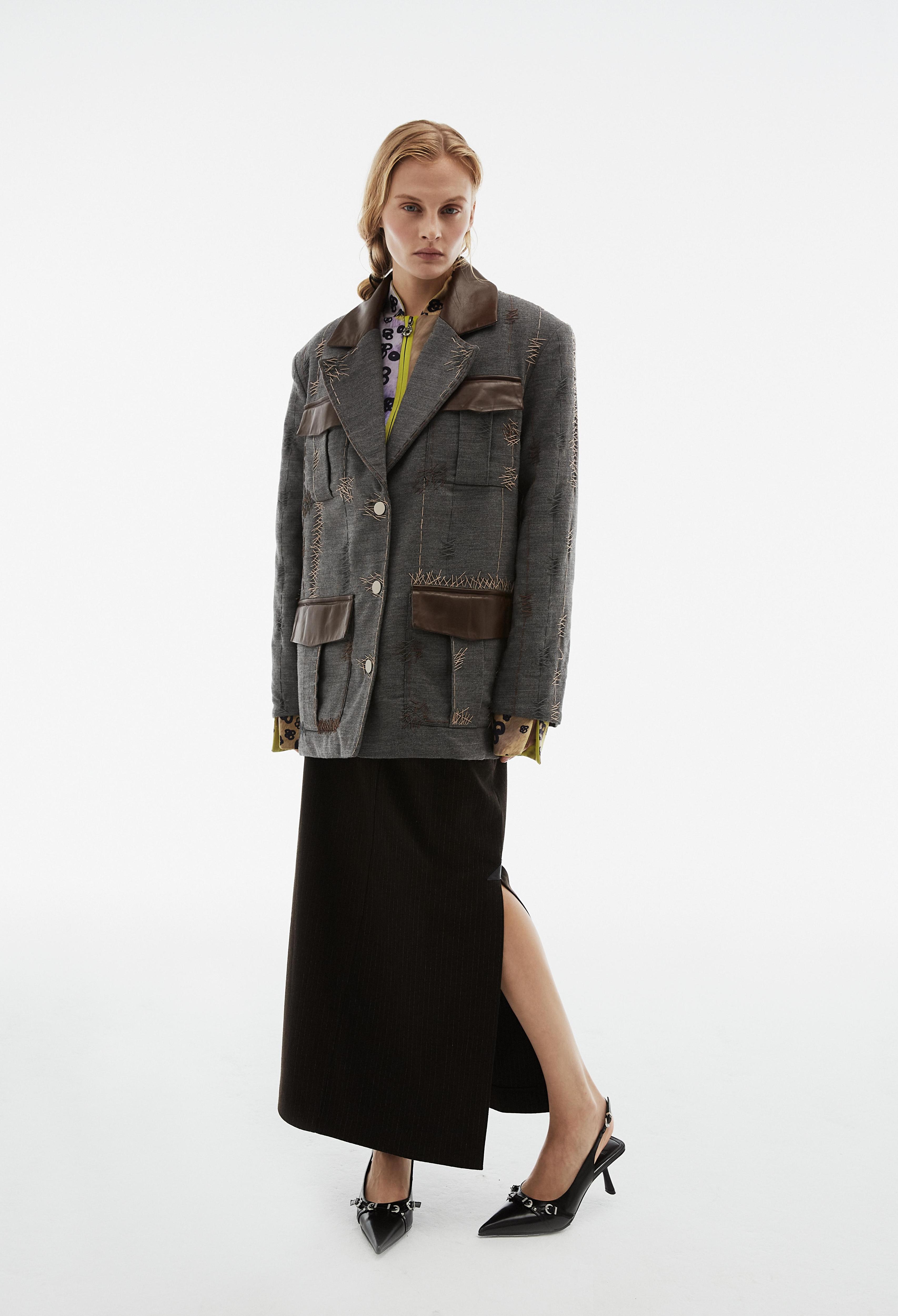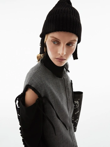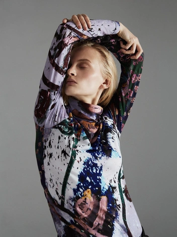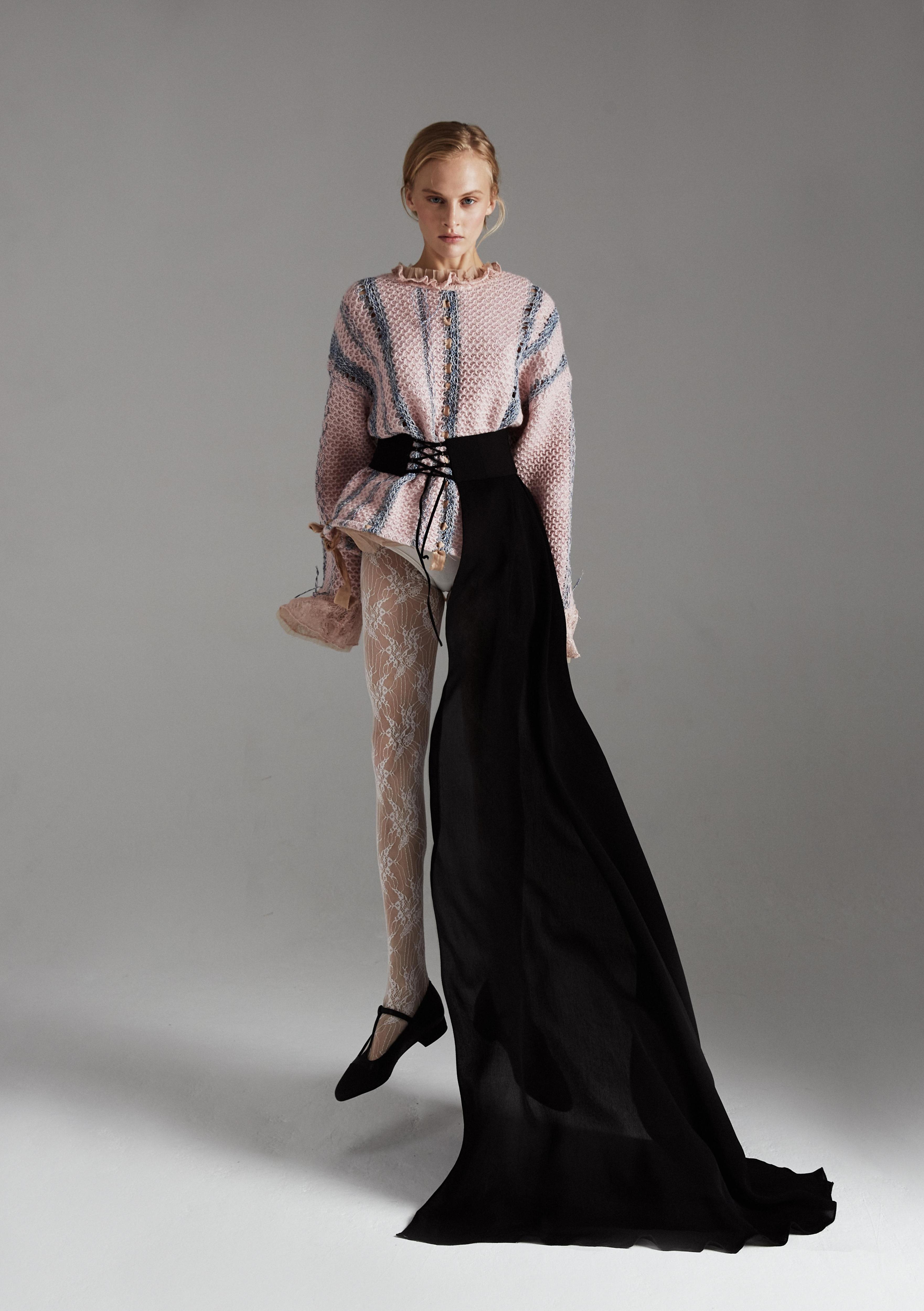 В центре коллекции облегченные пальто из нано-технологичного материала, усыпанные цветами, укороченные пиджаки с отделкой из кожи в дуэте с корсетом и ассиметричной юбкой. Эффектные колготки с авторским принтом и перчатки дополняют образ с блузкой, вдохновленной винтажным гардеробом бабушки дизайнера. В новой коллекции вы найдете не только необыкновенные предметы одежды, но и украшения из керамики — серьги и чокер в виде цветка неправильной формы, который стал символом коллекции.