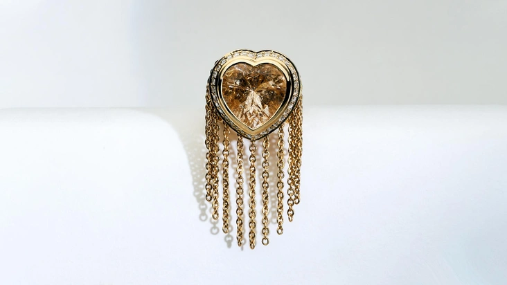 В этом сезоне розовый цвет продолжает быть актуальными, поэтому MIUZ Diamonds представляет модный оттенок во всем многообразии. Например, в кольце с бриллиантом в огранке «кушон» он стремится к тону сочного персика и мыслями отправляет нас во времена Марии-Антуанетты. Однако в 2023 году розовый цвет — это не только романтика и нежность, теперь с мотивами рококо соседствуют и рок-н-ролл, и истинная роскошь.
