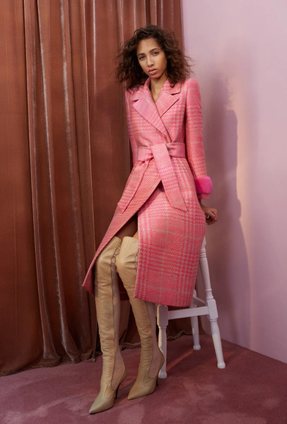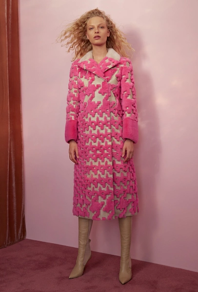 Примеров можно привести еще множество. В коллекции есть нежно-голубые платья со скошенным подолом. Складки, драпировки и лямки делают их силуэты графичными, при этом вещи не кажутся ни строгими ни агрессивными – они проникнуты духом resort и «невыносимой легкости бытия». Есть пальто с ярко-розовой вышивкой, похожей на интарсию на дорогой деревянной мебели – издалека вещь выглядит как эскиз к психоделической компьютерной игре из 80-х. Из таких же «пикселей» состоит розовая клетка еще на одном пальто – графичном и приталенном, с жесткой линией плеч.