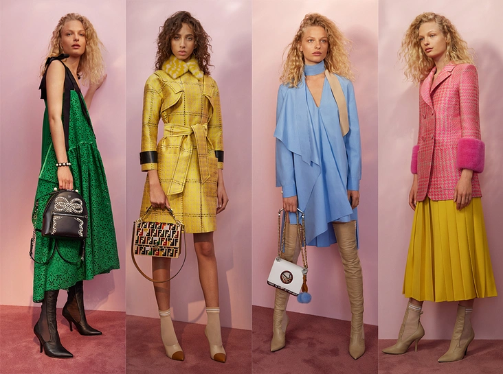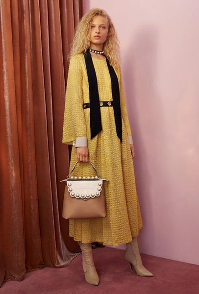 Как всегда у Fendi, отдельная тема – аксессуары. Привычные сумки жесткой прямоугольной формы – а кое-где и их съемные ремни - расшиты крупными бусинами и украшены логотипом бренда – кое-где он напечатан в стиле «поп-арт» - в виде множества разноцветных оттисков.