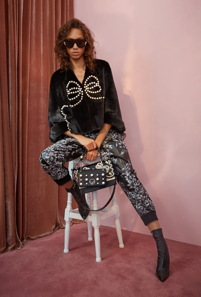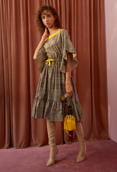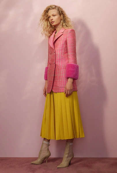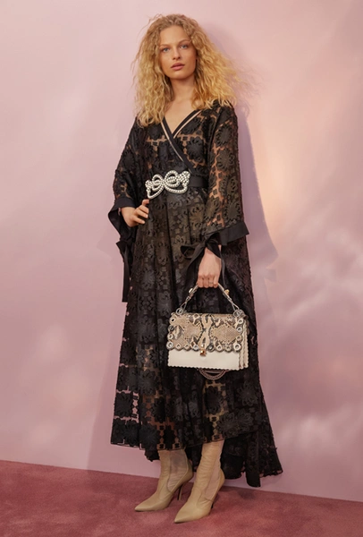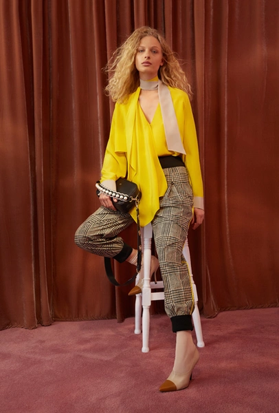 Клетки в коллекции вообще много – так же как бодрящей неоновой фуксии и семидесятнического ярко-желтого. Последний делает особенно эффектными платья и плиссированные юбки из гладкой, словно зеркальной, ткани. Есть в лукбуке и блок из коктейльных платьев. Особенно торжественным получился длинный наряд из черного кружева с широкими расклешенными рукавами и V-образным вырезом (снова 70-е!). Его пояс украшает пряжка, на которой бусины складываются в бант – издали его можно принять за бабочку, а это уже аллюзия на весенне-летнюю коллекцию, чьей темой стал волшебный лес.