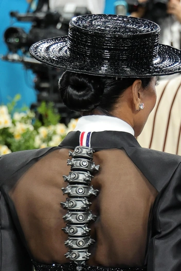 Предприниматель Мона Патель поручила Thom Browne создать костюм с имитацией позвоночника на спине — как бы намекая, насколько тяжело было денди пробивать себе дорогу в свет.