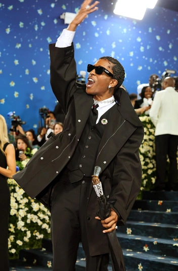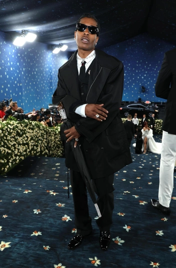 По темно-синему бархату одним из первых уверенно прошелся A$AP Rocky, ставший сопредседателем Met Gala. Образ одного из самых долгожданных гостей был выдержан в черном цвете, на фоне которого трость с рукояткой-пистолетом, усыпанная бриллиантами, выглядела еще более эффектно. Правда, многие не поняли посыла рэпера — совсем недавно его подозревали в убийстве во время перестрелки, а сегодня он как будто иронизирует над страшной ситуацией (читайте также: Бесподобный Доминго, прогульщик Леброн и Фаррелл в костюме из 100 тысяч жемчужин на Met Gala 2025).