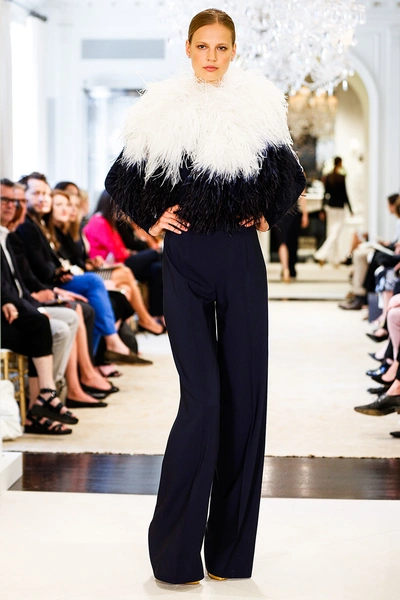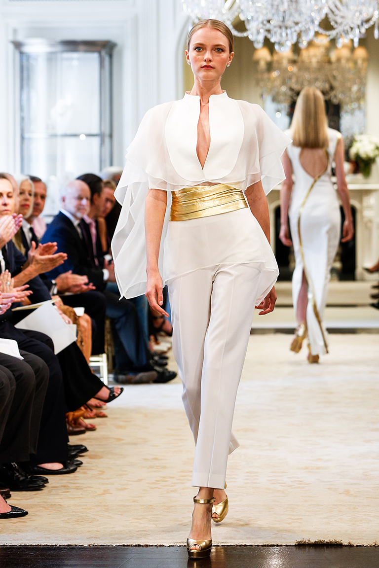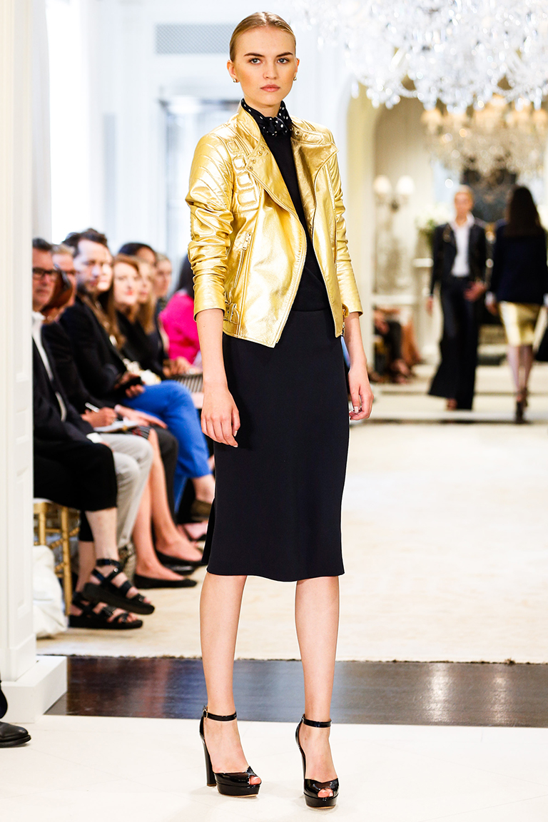 Плотная костюмная ткань дополнена невесомыми вставками из органзы, а белый костюм облегчают брюки свободного кроя из воздушного материала. Веселости комплекту придает черный галстук в белый горошек. Постепенно золотой оттенок с аксессуаров переходит на основные вещи: одна из моделей продемонстрировала черный трикотажный полупрозрачный свитер, надетый вместе с золотой юбкой и такого же цвета босоножками. В одном из выходов представили золотой жакет, надетый поверх простого маленького черного платья. Среди всей этой почти французской изысканности 60-х с беретами и строгими силуэтами удивляют кожаные брюки клеш, надетые вместе с курткой-косухой. Один из последних выходов – белые брюки с удлиненной туникой с рукавами «летучая мышь», а также декольте почти до пояса – удивляет своей легкостью и воздушностью. Именно он достойно подводит итог коллекции, возвышая женщину от простой отдыхающей до греческой богини.