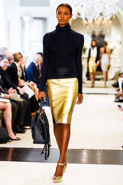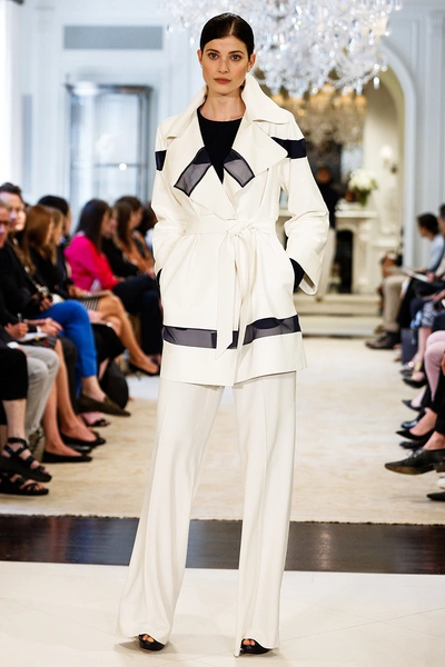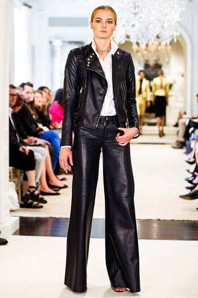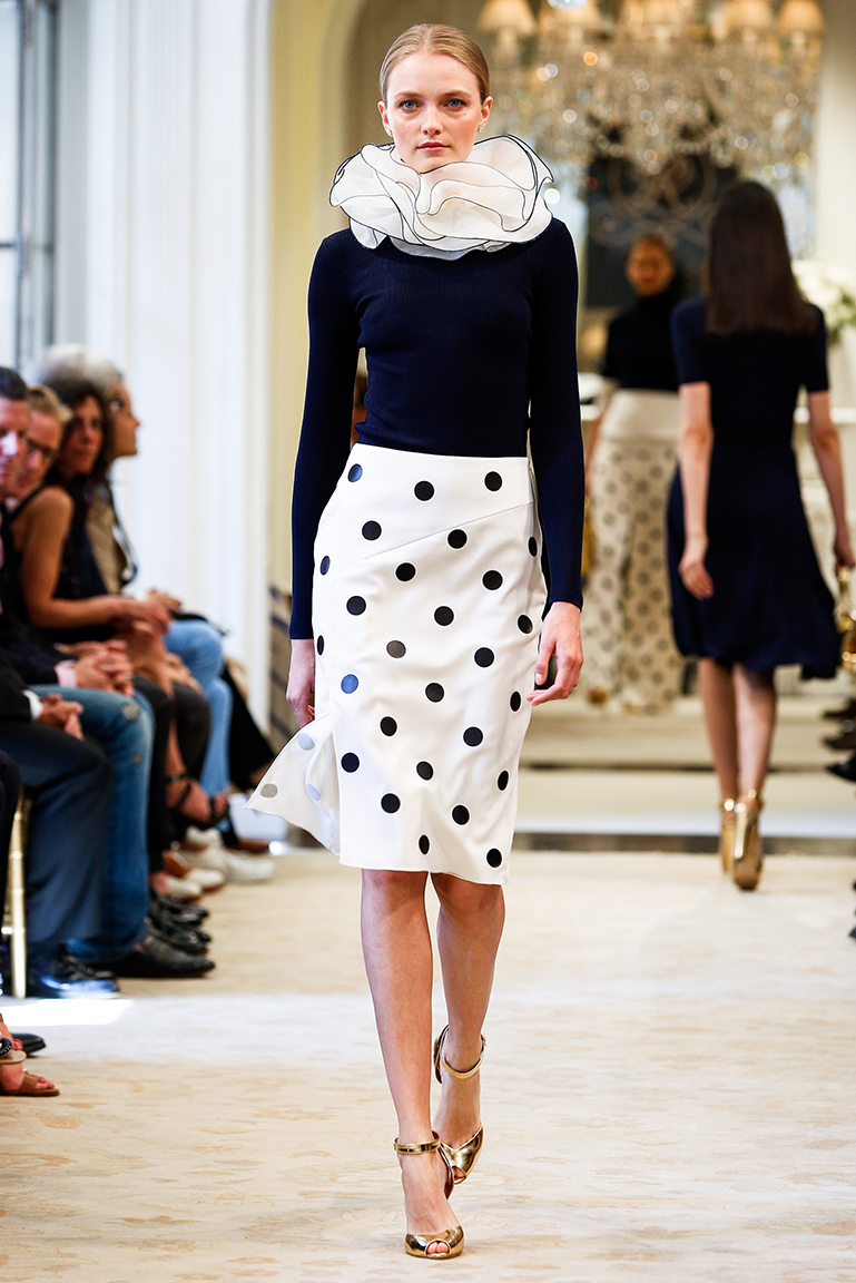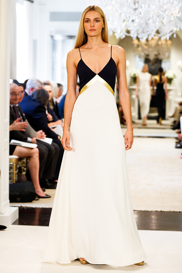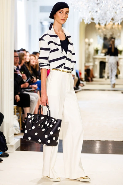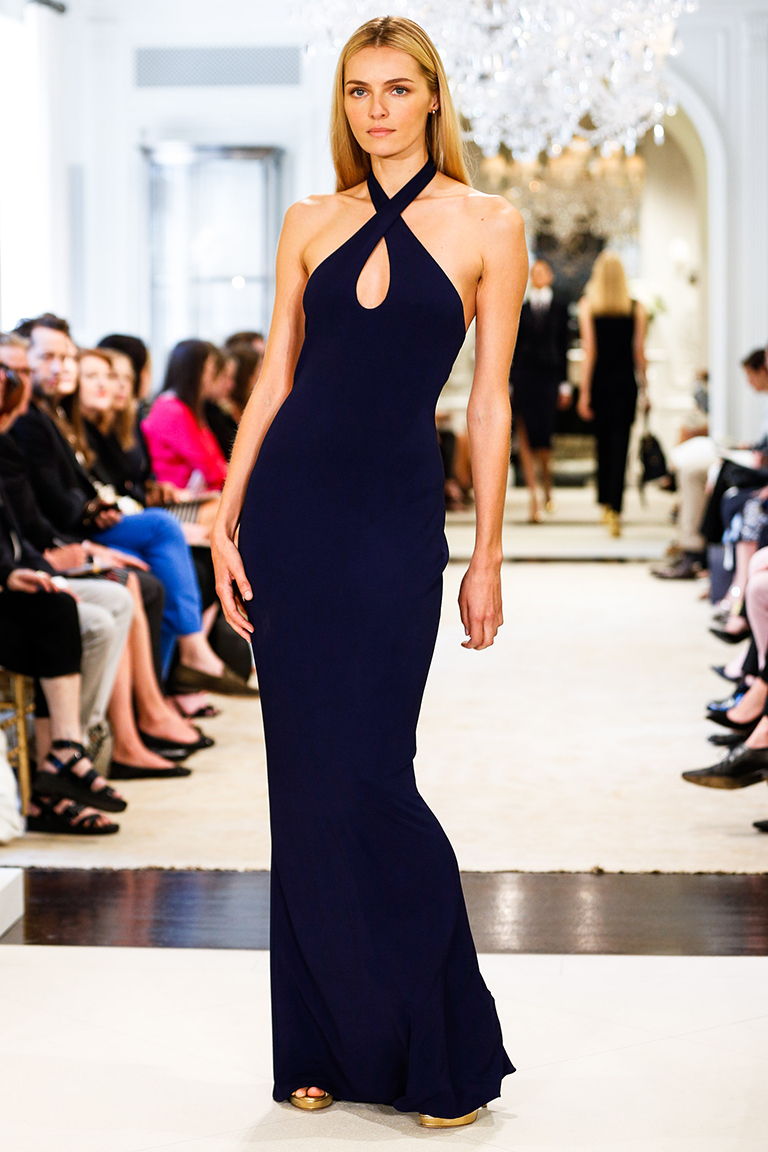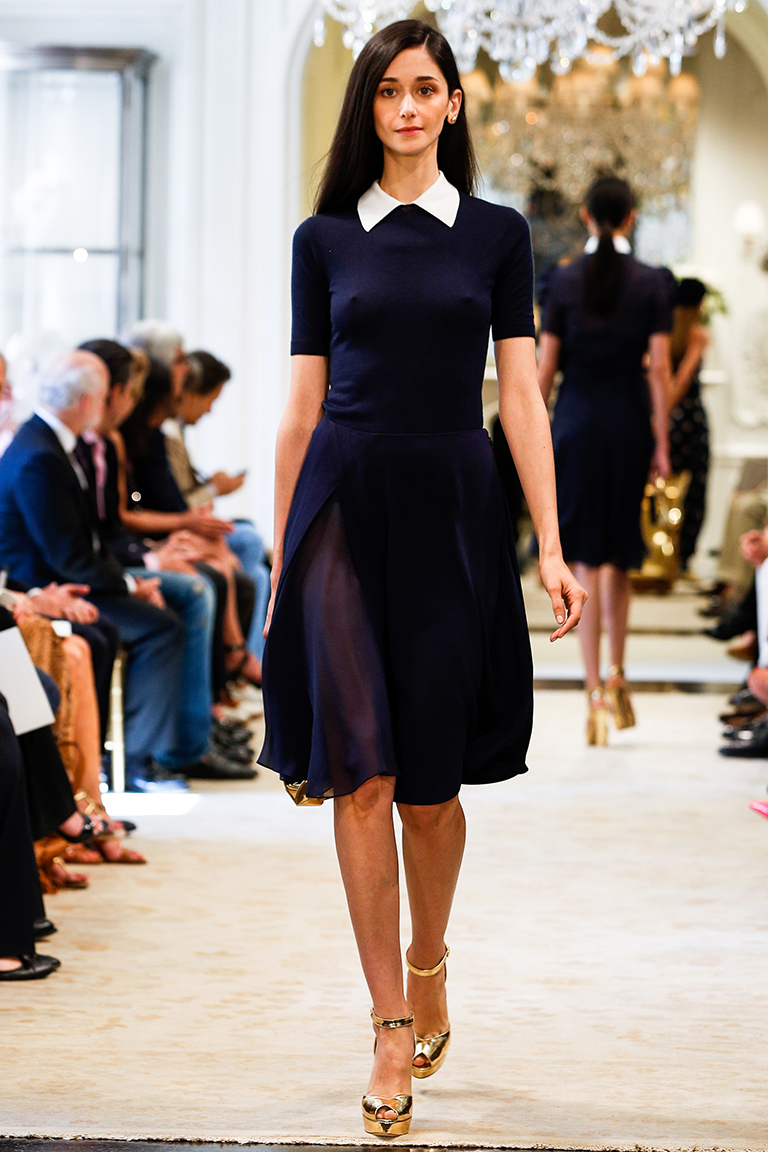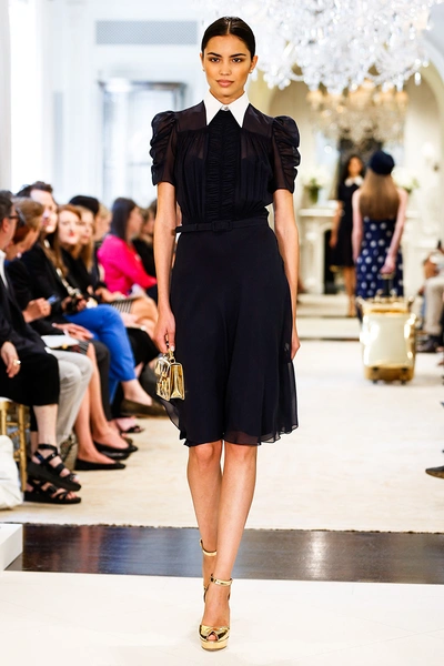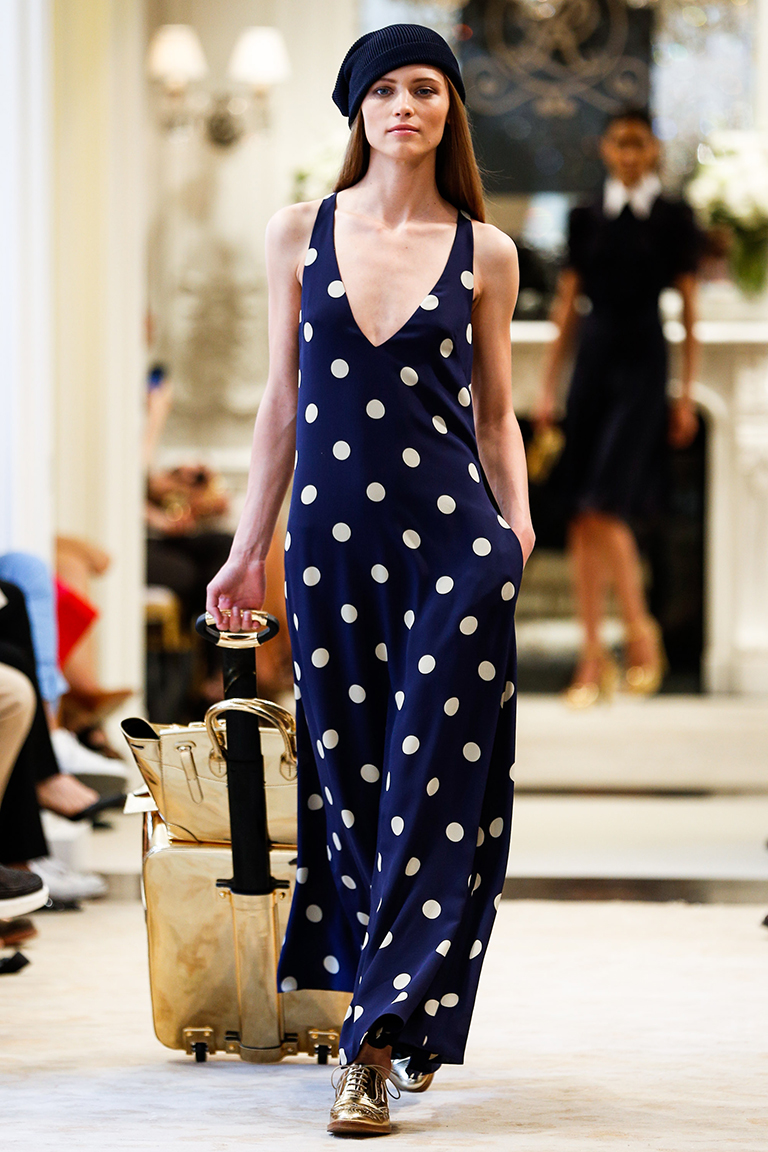 Ральф Лорен представил свою круизную коллекцию – 2015. Его девушки на отдыхе выглядят элегантными, одеты в черно-белую гамму с синими оттенками. Образ с платьями простых силуэтов дополняют большие воротники-жабо, делающие девушек похожими на цветы, золотые аксессуары в виде сумок, ремней и босоножек и белые воротнички на классических строгих платьях.