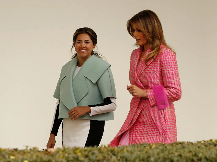 Новое послание первой леди – куда более милое, чем предыдущие модные заявления. Во время приема президента Колумбии Ивана Дуке и его супруги Марии Юлианы Руис Мелания выбирает нежно-розовый наряд, поддерживая тематику наступающего Дня святого Валентина. Перед колумбийской парой она предстала в пальто в клетку от Fendi с меховыми деталями оттенка фуксии на рукавах, которые, однако, были ей немного коротки. Стоимость нежного праздничного наряда составила $2110. В пару к нему первая леди США поставила нюдовые лодочки Christian Louboutin за $695 – эта модель обуви уже давно стала неотъемлемой частью образа не только Мелании, но и других модных представительниц политической элиты, аристократок и монарших особ (читайте также: Сговорились: любимая деталь образов королевских особ Европы).