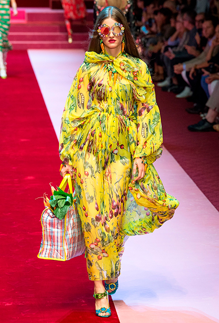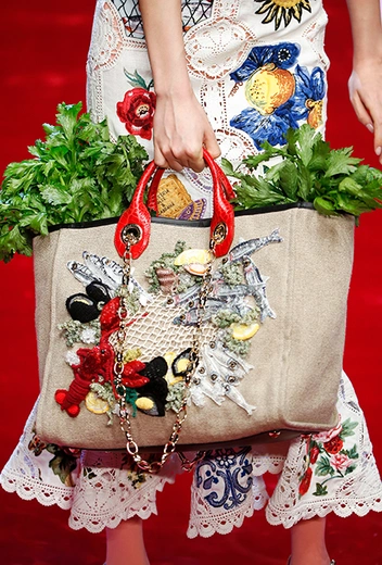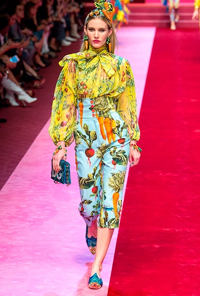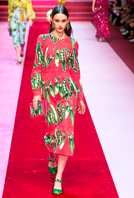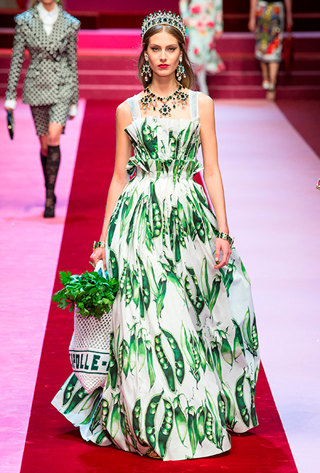 Где любовь, там радость жизни, а где радость жизни, там – еда. Дизайнеры не отказались от другой своей излюбленной темы, «кулинарных» принтов. Правда, теперь их «меню» стало более здоровым. Вместо пасты – зелёный горошек, кочаны капусты и пучки редиски. Все это вполне соответствует общей канве – сладости и макароны обожают дети, взрослые же, выбирая продукты, стараются быть осмотрительнее.