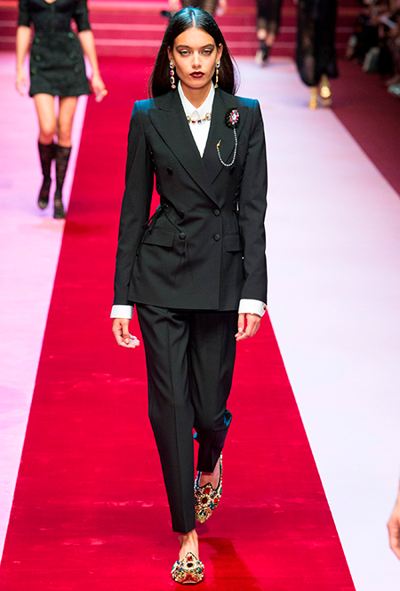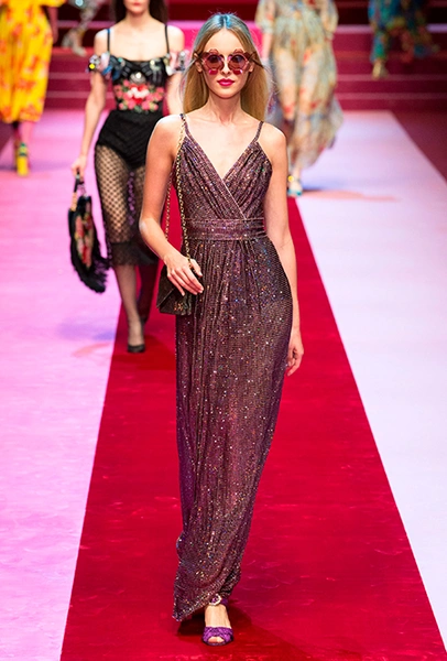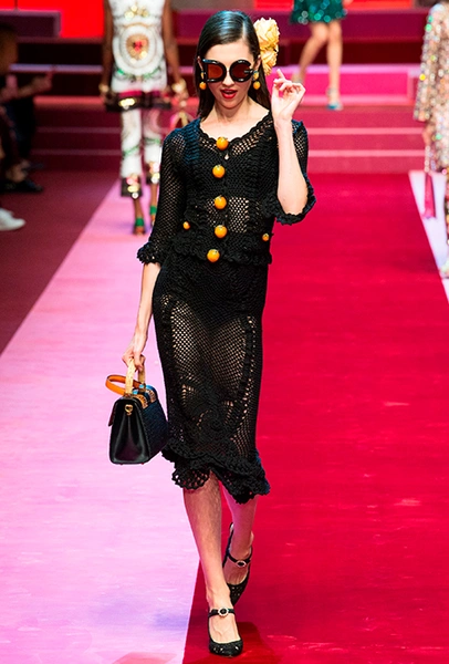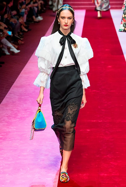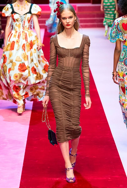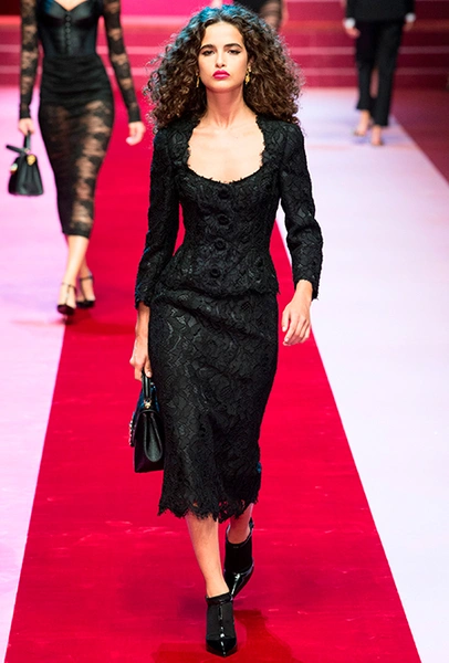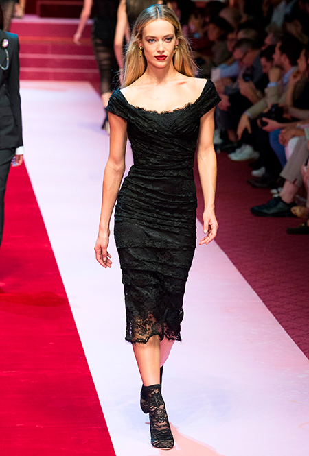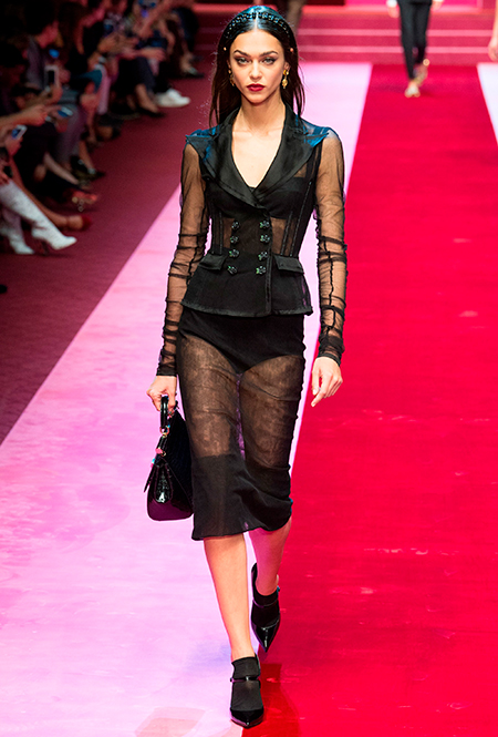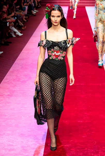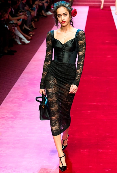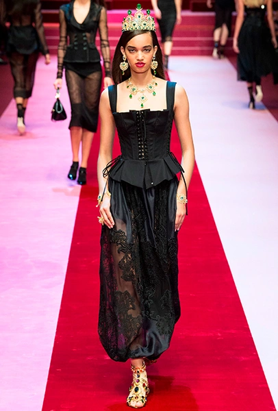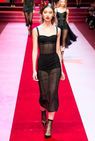 Однако последний показ показал, что бренд в какой-то степени возвращается к корням. Первый блок и вовсе был абсолютно «взрослым» – из соблазнительных чёрных платьев-корсетов и облегающих невесомых нарядов, под которыми можно разглядеть во всех подробностях шикарное нижнее белье. Все это отлично смотрелось бы на Монике Белуччи, женщине, с которой давно и прочно ассоциируются «подлинные» Dolce & Gabbana.