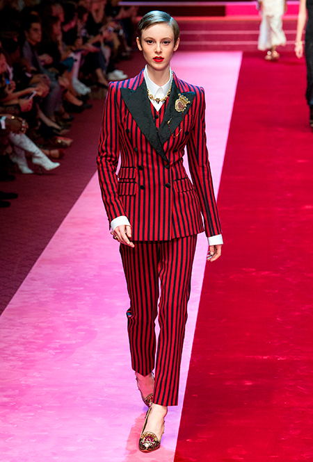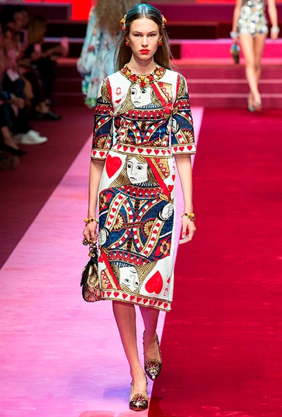 Дальше гости вновь увидели вещи пёстрые, ироничные и игривые – но тоже, что называется, «в рамках разумного». Главными принтами стали крупные и яркие рисунки в виде игральных карт. Доменико и Стефано окрестили коллекцию Queen Of Hearts, где королеву червей вполне можно назвать королевой сердец – это не будет ошибкой, ведь посвятили они свои творения не больше не меньше «любви, которую можно отыскать повсюду». В тему отлично ложатся и принты в виде радужных полосок – они, видимо, призваны напомнить о том, что любая любовь прекрасна и имеет право на существование.