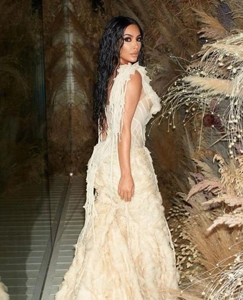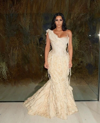 На выставке «Thierry Mugler: Couturissime» в 2019 году Ким решила поддержать одного из своих любимых дизайнеров. Звезда надела розовое полупрозрачное платье на одно плечо, которое украшал плотный золотой корсет. Этот образ — часть кутюрной коллекции Thierry Mugler осень-зима 1999.