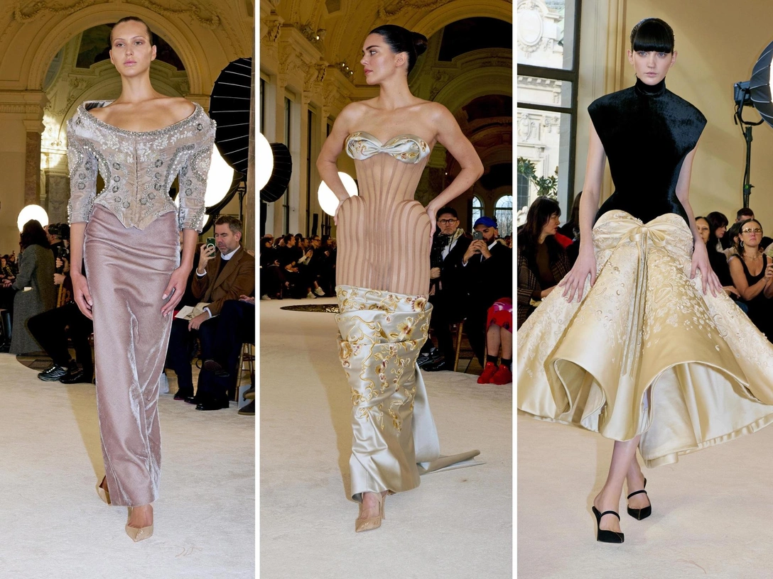 Силуэты во многом отсылают к ранним коллекциям Schiaparelli — жакеты похожи на куртки из коллекций 30-х годов прошлого века, а надетые под них юбки с вышивкой напоминают о моде 90-х. Ощущается также присутствие Кристиана Диора и его любви к акценту на бедрах. Он есть в платьях — правда, Розберри сочетал пышную юбку с заниженной талией, намекая на моду «ревущих» 20-х. А также в корсетных топах с острыми углами в зоне бедер (читайте также: Кутюрная Неделя моды: обзор показа Christian Dior).