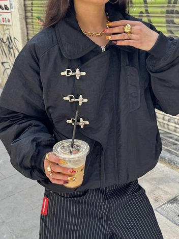 Речь идет о всевозможных бомберах и пуховиках, отличительная черта которых — карабины или крючки вместо классических пуговиц. Судя по фотографиям из соцсетей, их разнообразие поразительно велико: инфлюенсеры то и дело выгуливают варианты из пальтовой шерсти, кожи, денима, замши и других материалов. Однако общие характеристики остаются неизменными: особые застежки и укороченная длина.