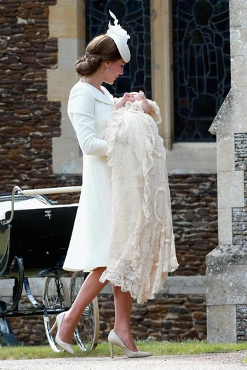 Принцесса Кэтрин показывала схожие платья от Alexander McQueen по случаю крещения своих детей в 2015 и 2018 годах. Так, для крещения маленькой Шарлотты в июле 2015 года, Кэтрин предпочла платье-пальто белоснежного оттенка со складками на вороте. Тремя годами позже Кейт была в платье того же оттенка с небольшим вырезом в зоне декольте и сборками на рукавах.