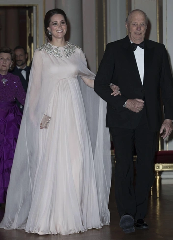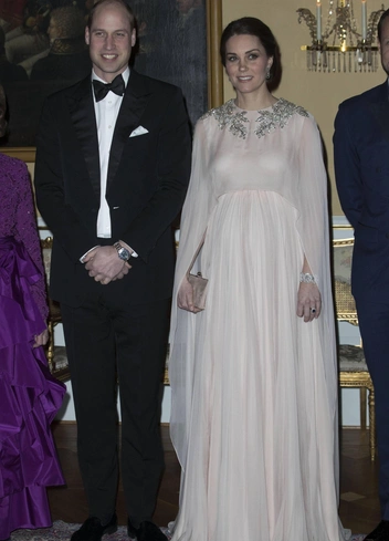 Герцогиня Кембриджская была обязана выглядеть безупречно даже во время своей беременности, и совсем неважно, чего ей это стоило. И любимый британский Дом помогал ей не ронять планку, создавая все новые шедевры. Для государственного визита в Норвегию Кейт выбрала пудровое платье Alexander McQueen с длиной в пол и шлейфом, закрывающим линию рук. Зону ворота платья герцогини украшали серебряные декоративные элементы в виде листьев.