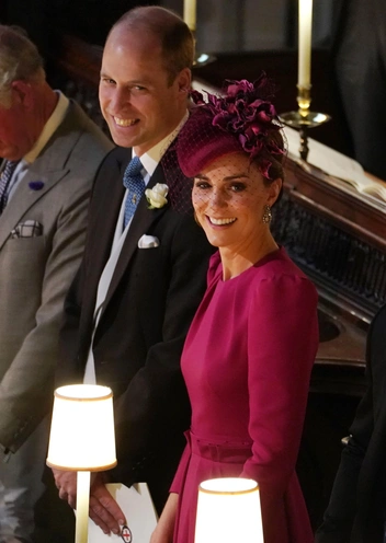 Нежный цвет удачно сочетался с цветом кожи герцогини, а неглубокий вырез разнообразил наряд длиной ниже колена и с закрытой линией рук. Годом позже Кэтрин продемонстрировала платье свежего ягодного оттенка для свадьбы принцессы Евгении и Джека Бруксбанка. Кейт составила яркий, но классический образ, дополнив его шляпкой в тон.