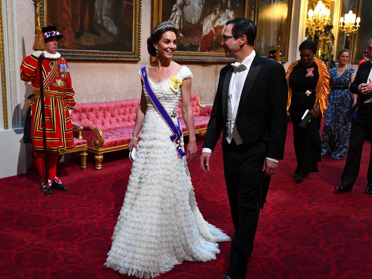 В 2019 году, уже на приеме глав США, Кейт Миддлтон надела белоснежное платье Alexander McQueen с каскадной юбкой с оборками и открытой линией рук, дополнив образ все той же тиарой Lover’s Knot.