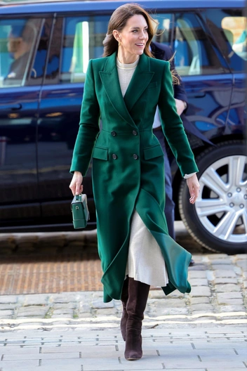 В 2023 году Кейт надела пальто, выполненное в одном из ее фирменных цветов — изумрудном. Под верхнюю одежду герцогиня надела платье Виктории Бекхем, также британского дизайнера.