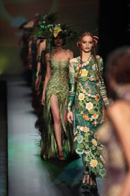 После этого появляется одна из основных тем его творчества – этнические мотивы. В 1997 году Жан-Поль Готье создает невероятно яркую коллекцию, посвященную Мексике и художнице Фриде Кало. Его девушки выходят на подиум в национальных мексиканских платьях, пончо, с густыми бровями и высокими прическами с цветами, куря сигары.