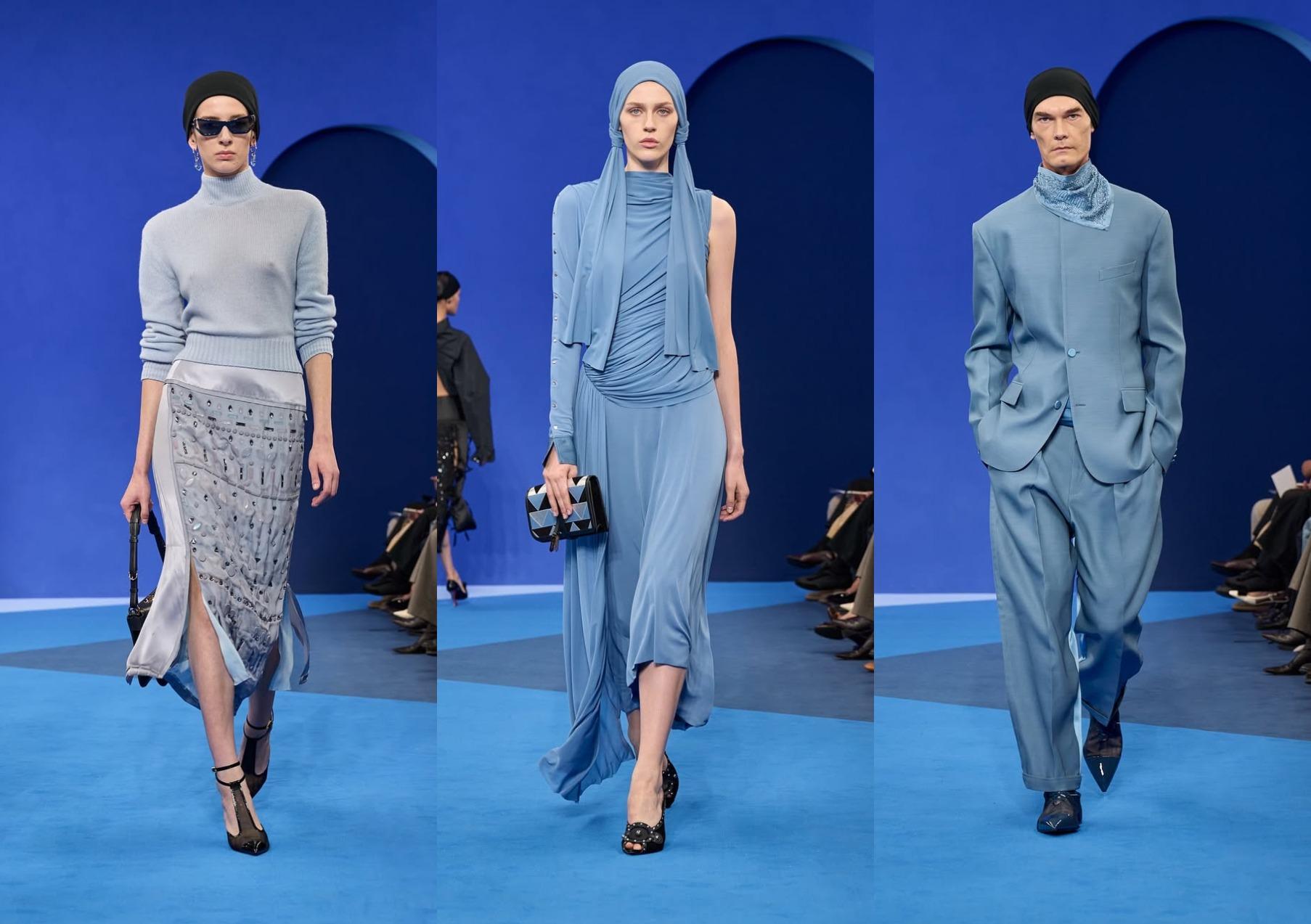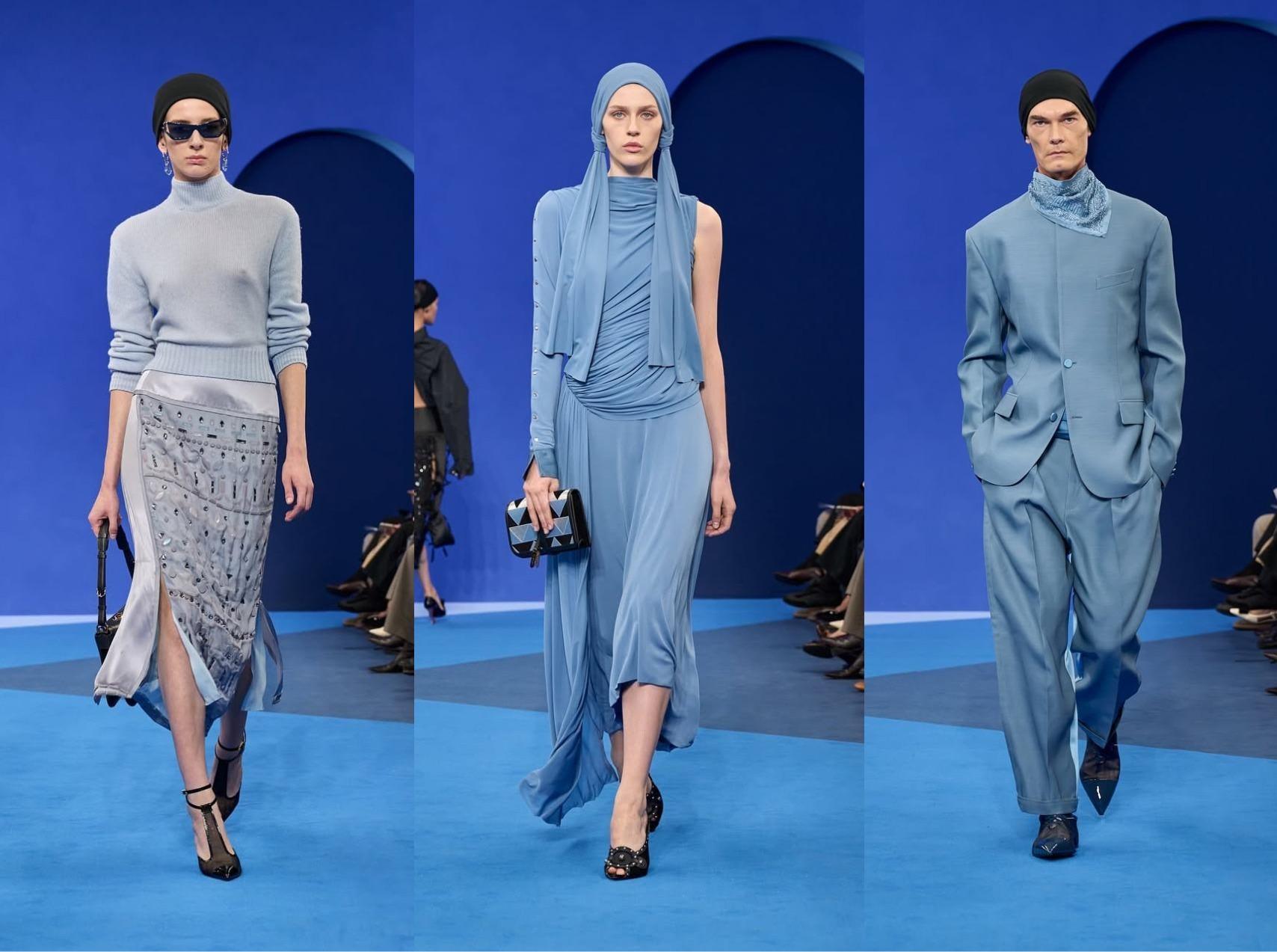 Стоит отметить, что возврат к своему ключевому коду бренд анонсировал еще за неделю до показа. Тогда в соцсетях Дома появились публикации, в которых была представлена новая упаковка — голубые пакеты с логотипом. А также намек на то, что в ближайшее время оттенок вернется в коллекции Lanvin.