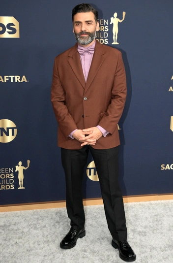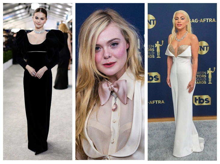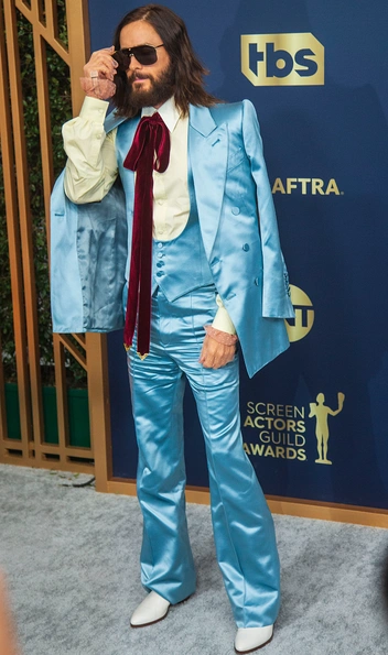 Некоторые звезды, вроде Эль Фэннинг и Джессики Честейн, получившей SAG Award за роль в фильме «Глаза Тэмми Фэй», выбрали брюки. На Джессике был костюм из шелкового жаккарда из кутюрной коллекции Dior, надетый на голое тело. Эль выбрала образ в мужском стиле: костюмные черные брюки с пайетками, нежную кремовую блузу с запонками и жилет в тон, дополненные бантом. Под стать Фэннинг одет был и Джаред Лето, не перестающий демонстрировать приверженность Gucci и на этот раз дополнивший костюм итальянской марки бордовым шейным бантом и полупрозрачными перчатками.