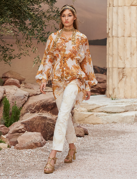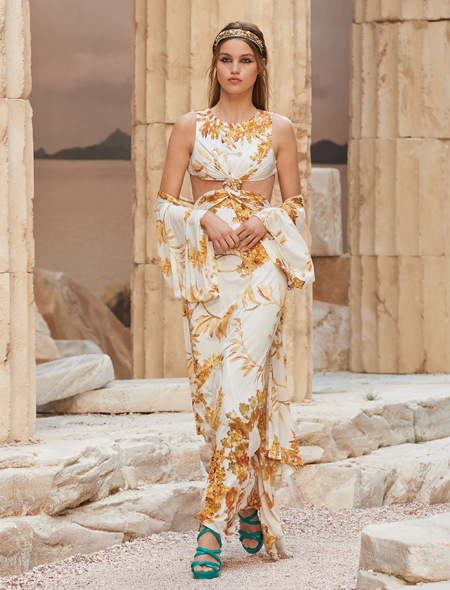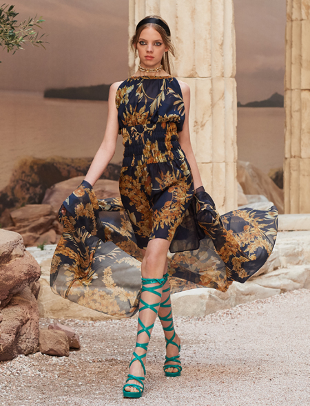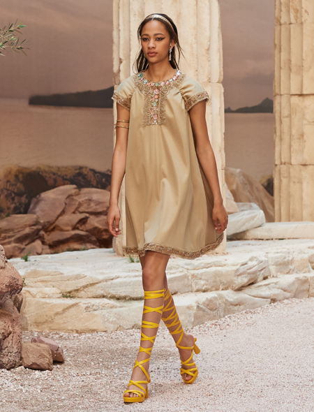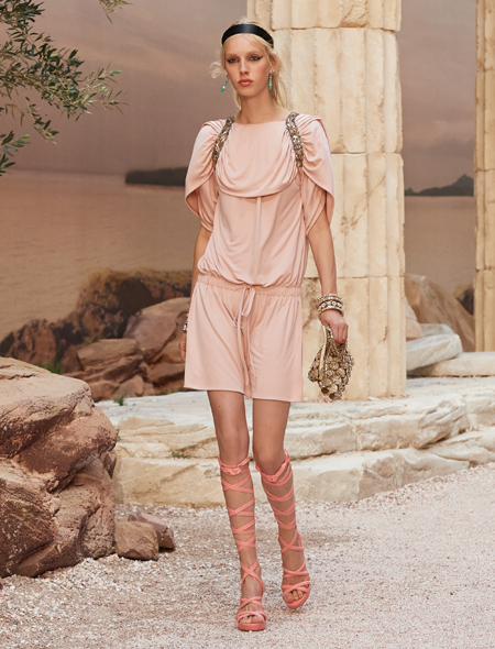 Где-то ткань мерцает как настоящее золото, делая лифы платья и корсеты, похожими на детали обмундирования античных воинов. Где-то цвет по-шанелевски приглушен, но, даже уходя в благородный бежевый, издалека он напоминает драгоценный металл. Блеска добавляют стразы – ими расшиты те самые корсеты и длинные платья из летящей полупрозрачной ткани – и аксессуары: золотистые ободки, колье, босоножки и сандалии-«гладиаторы».