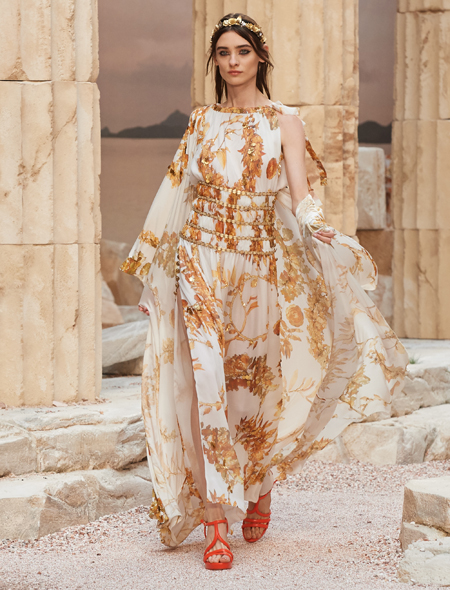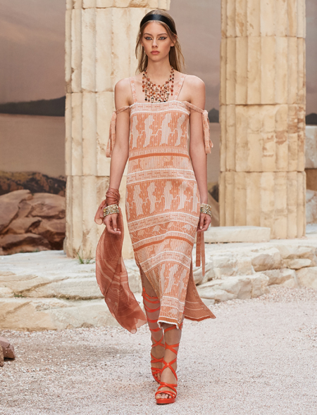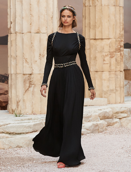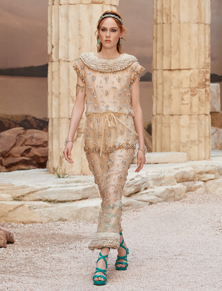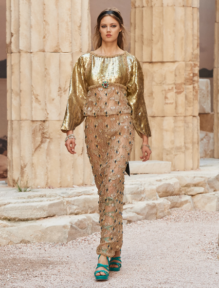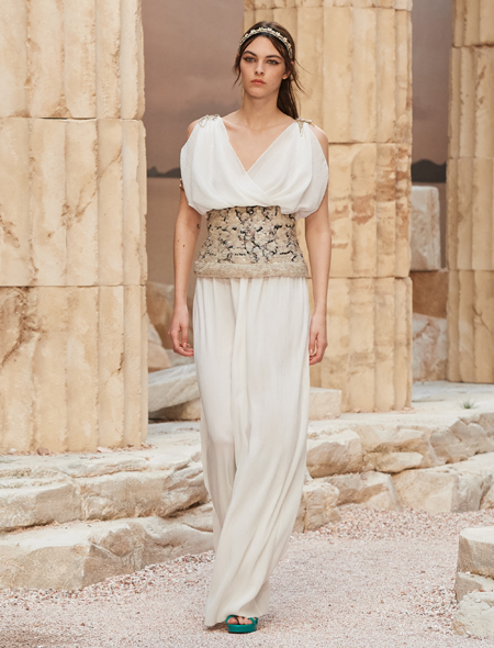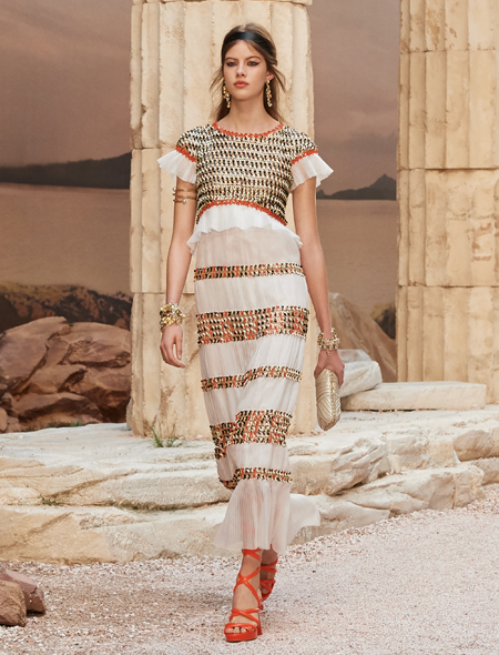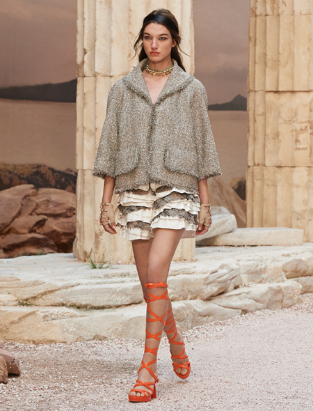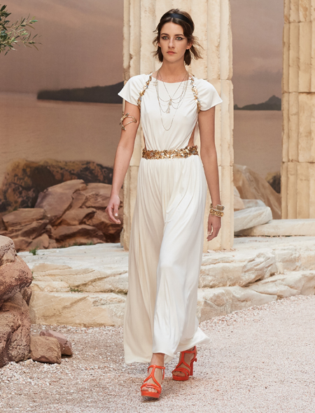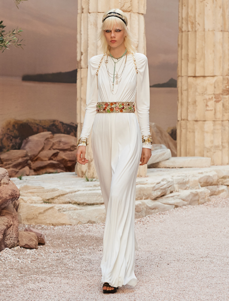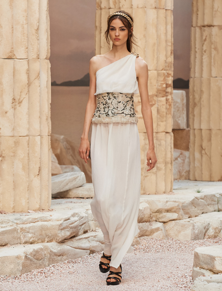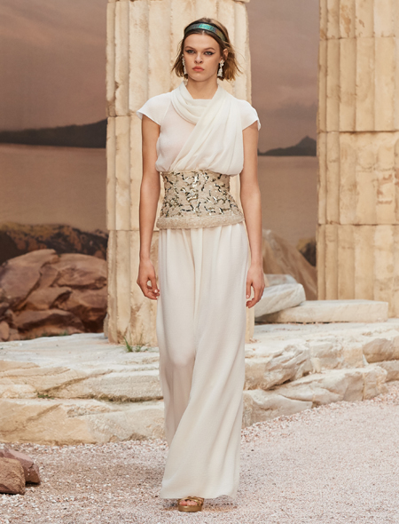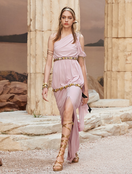 Нетрудно догадаться, что основной темой стали «римско-греческие» мотивы в одежде. Лагерфельд сумел интерпретировать туники и хитоны в фирменной манере Chanel, не жалея твида, оставляя края «античных» платьев и юбок необработанными.