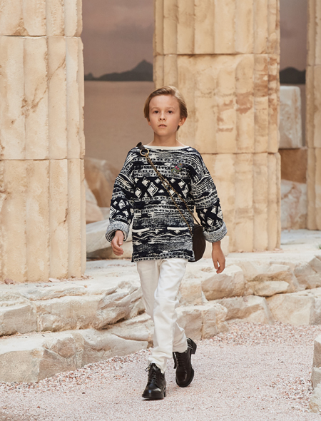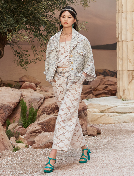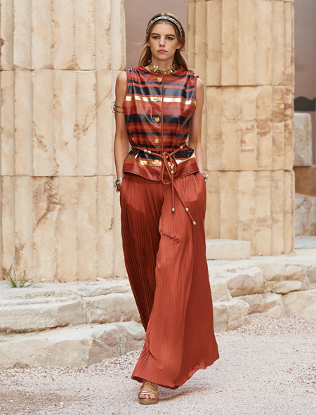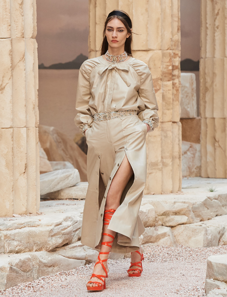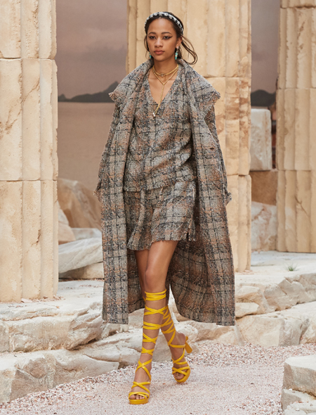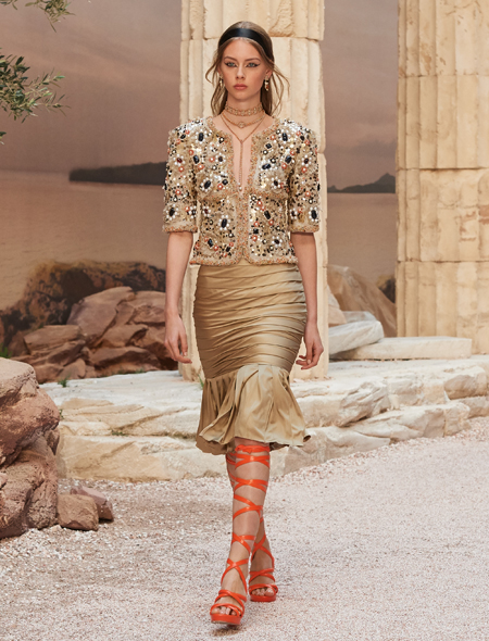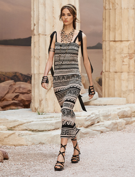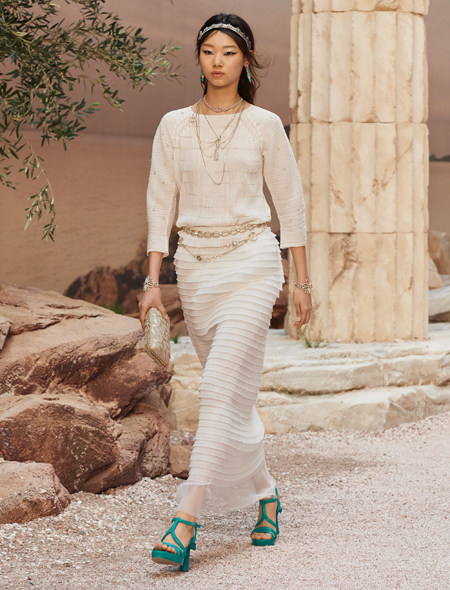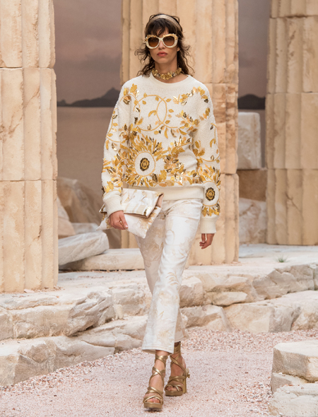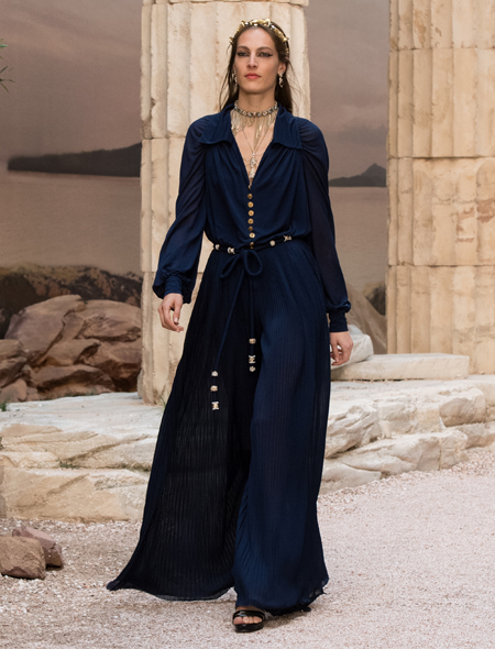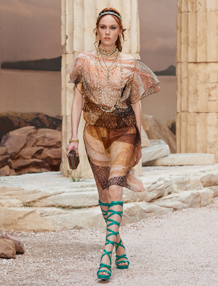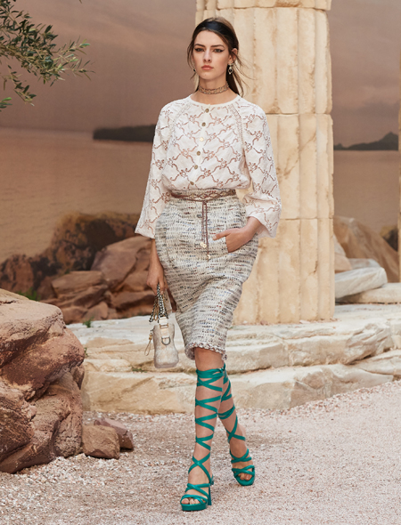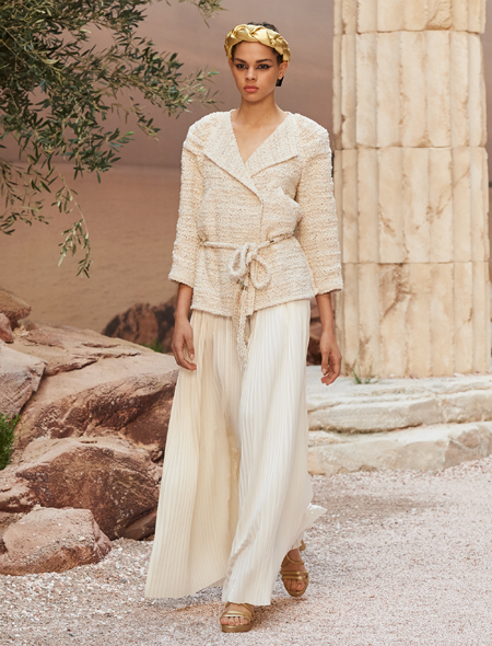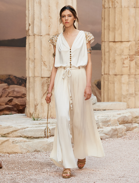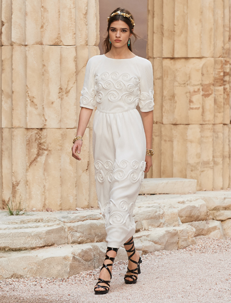 Впервые за много лет показ круизной коллекции Chanel прошел в Париже (до этого ареной для действа становились, в числе прочего, Дубай, Сеул и Гавана). Но даже на сей раз все было обставлено так, словно шоу проходило за много километров от родины бренда. Карл Лагерфельд распорядился арендовать один из залов Гран Пале, который, специально для Chanel, превратили в подобие развалин древнегреческого храма – с колоннами и каменными статуями. Одна из скульптур была привезена из квартиры Коко Шанель на улице Камбон – мадемуазель, как известно, была влюблена в античную культуру.