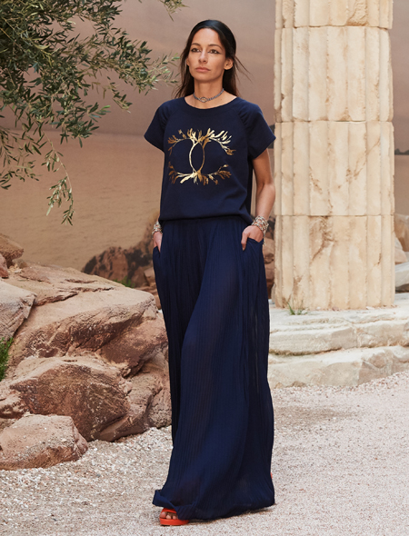 Одним из основных цветов коллекции стал золотой. Особенно запоминается по-новому интерпретированный логотип марки в виде двух скрещенных «С» – буквы на вещах из круизной коллекции напоминают два золотистых лавровых венка. Лавр, как известно, античный символ праздника и триумфа.