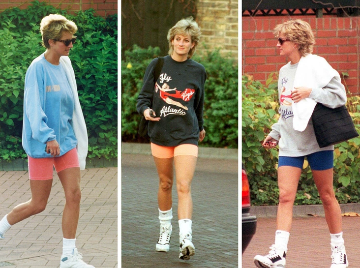 Аутфиты Дианы вполне актуальны и сейчас. Цветные и белые велосипедки в сочетании с ярким или серым свитшотом свободного кроя, кроссовками и высокими носками прекрасно впишутся в повседневный гардероб на начало осени. При желании наряд можно дополнить oversize-жакетом или тренчем, а также завершить аутфит солнцезащитными очками, вместительной сумкой или шоппером и минималистичными украшениями (читайте также: Покорят ваше сердце: самые модные украшения осени и зимы 2022/23, без которых не обойтись).