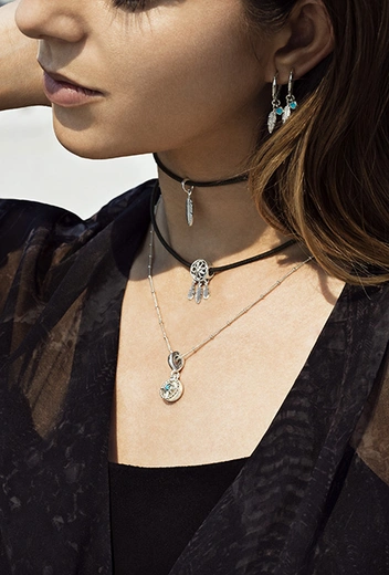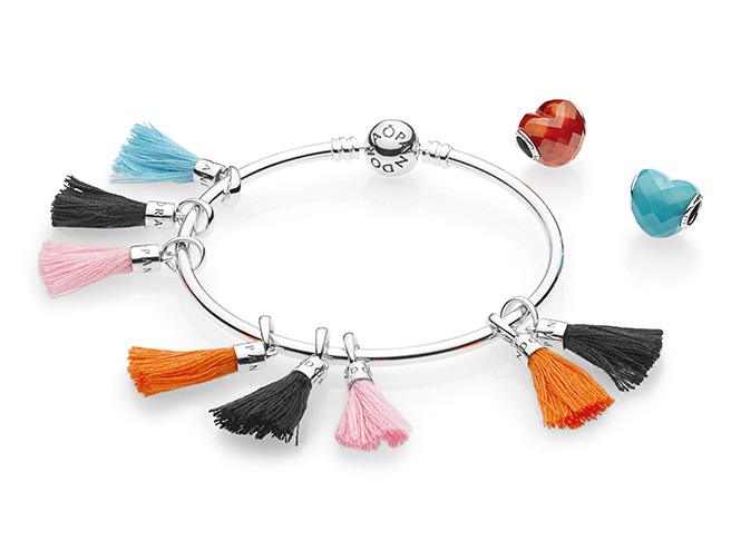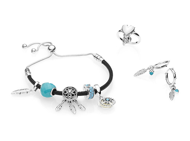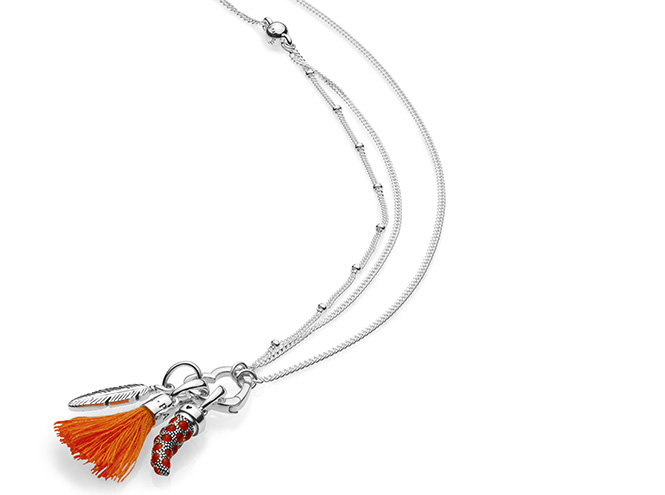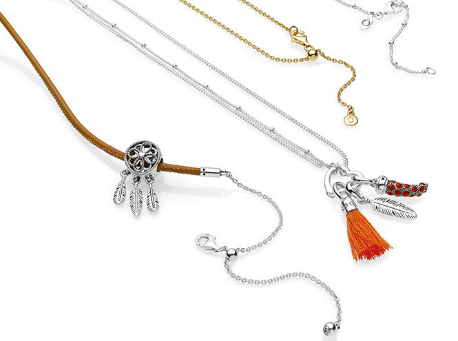 В летнюю коллекцию вошли разноцветные кожаные браслеты, двойные цепочки на шею, подвески-кисточки, серьги в виде перьев, серебряные кольца и шармы-талисманы. Романтику, ищущему любовь, подойдут шармы в виде слова love и сердца, инкрустированные розовыми, желтыми, зелеными и синими кристаллами. Страстному путешественнику — чемодан, украшенный цветной эмалью, самолет и земной шар, мечтателю — ловец снов, стаканчик кофе с эмалью нежно-розового цвета и якорь, который можно подарить важному человеку. На нем так и написано: «Закрепи себя за кем-то особенным». Кожаные браслеты со съемными кистями в стиле бохо можно надеть и в офис, и на вечеринку и даже на свадьбу к друзьям на морском побережье. Кстати, яркие кисточки легко превращаются в подвески на шею.