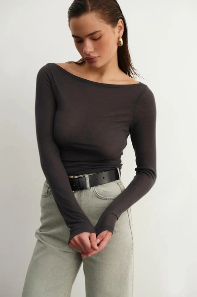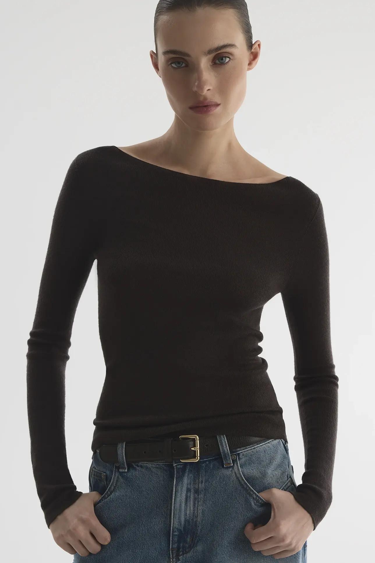 Думаете, что лонгслив всегда смотрится спортивно? Эта модель с аккуратно спущенными плечами вас переубедит. В моде как лонгсливы с вырезом «лодочка», который лишь слегка открывает плечи, так и модели с заметно спущенной линией плеч.