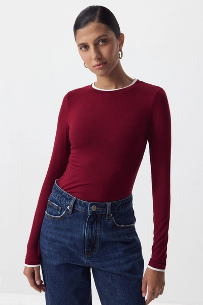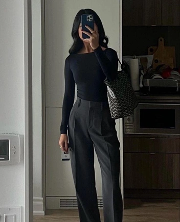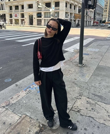 Лонгслив — это та самая вещь, которая не противоречит объемному низу, ведь благодаря своей структурной базе он хорошо держит форму. К трикотажному лонгу серого или белого цвета подойдут джинсы бэгги, к лонгсливу драматичного бордового или черного — юбка длины макси или брюки палаццо в черном цвете.
